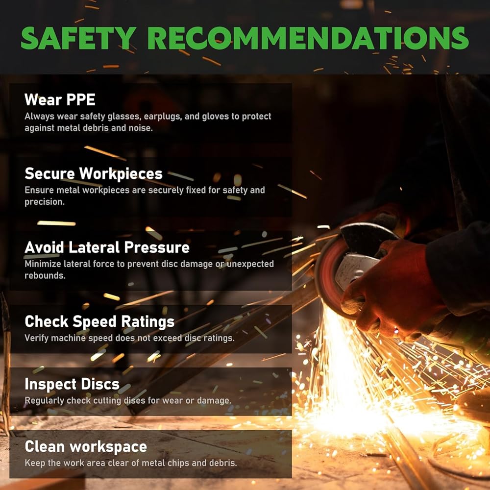 【Safety Tips】Always wear proper protective gear (eye, ear, face, hand, body protection) when using these grinder blades. Do not exceed the recommended maximum speed.