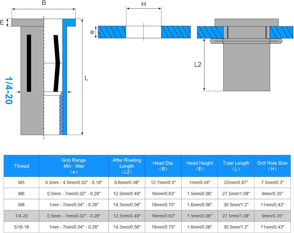 Rivet Nuts: Thread Diameter: 1/4-20; Total Length: 27.5mm / 1.08"; Head Size: 16 x 1.5mm / 0.63" x 0.06"(D*T); Rod Diameter(Drill Hole Size): 9mm / 0.35"; Length after Riveting: 12.5mm / 0.49"; Rivet Plate Thickness: 0.5-7mm / 0.02"-0.28";