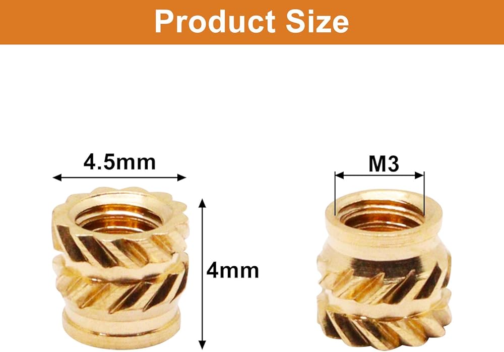 Wide Application: These heat set insert are widely used in various applications, such as 3D printing, plastic moulding, and furniture manufacturing. Suitable for plastic types of, such as PC, PA, ABS, PETG, and more. Different sizes ensure compatibility with different bore and thread sizes, enabling a variety of applications