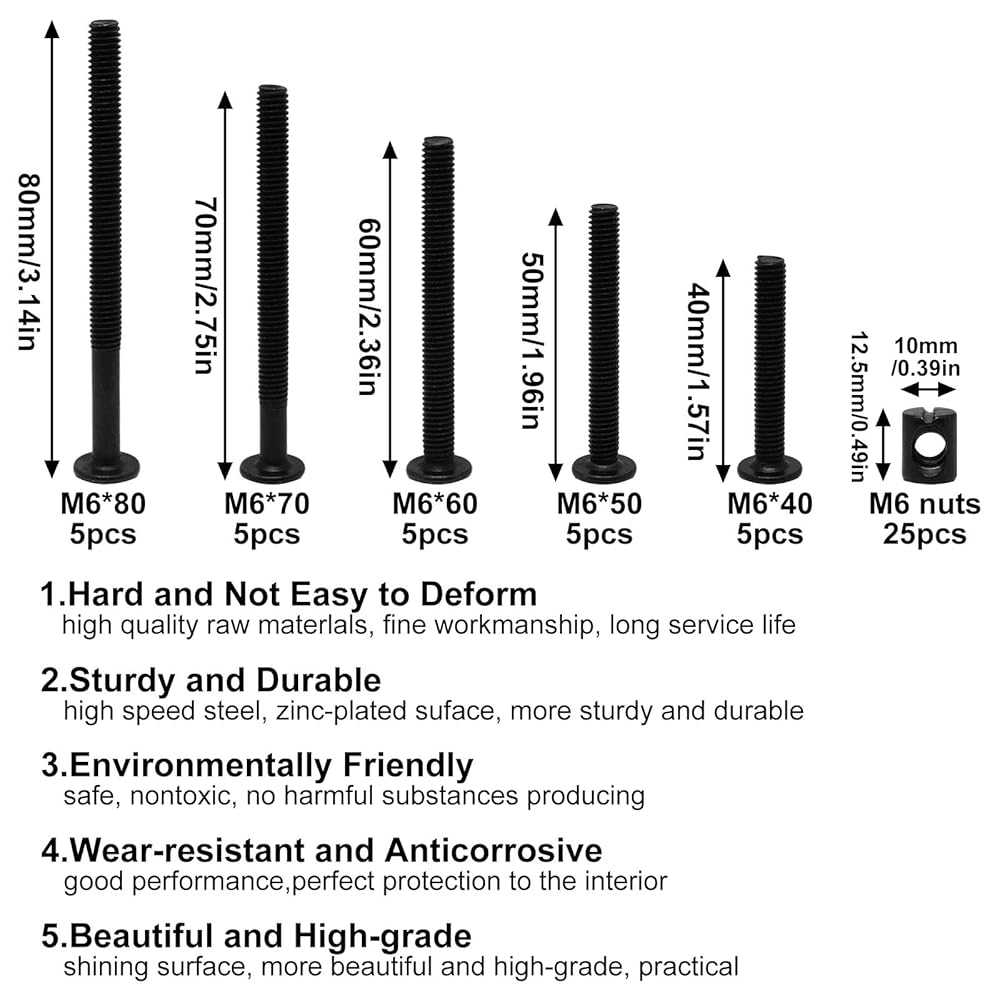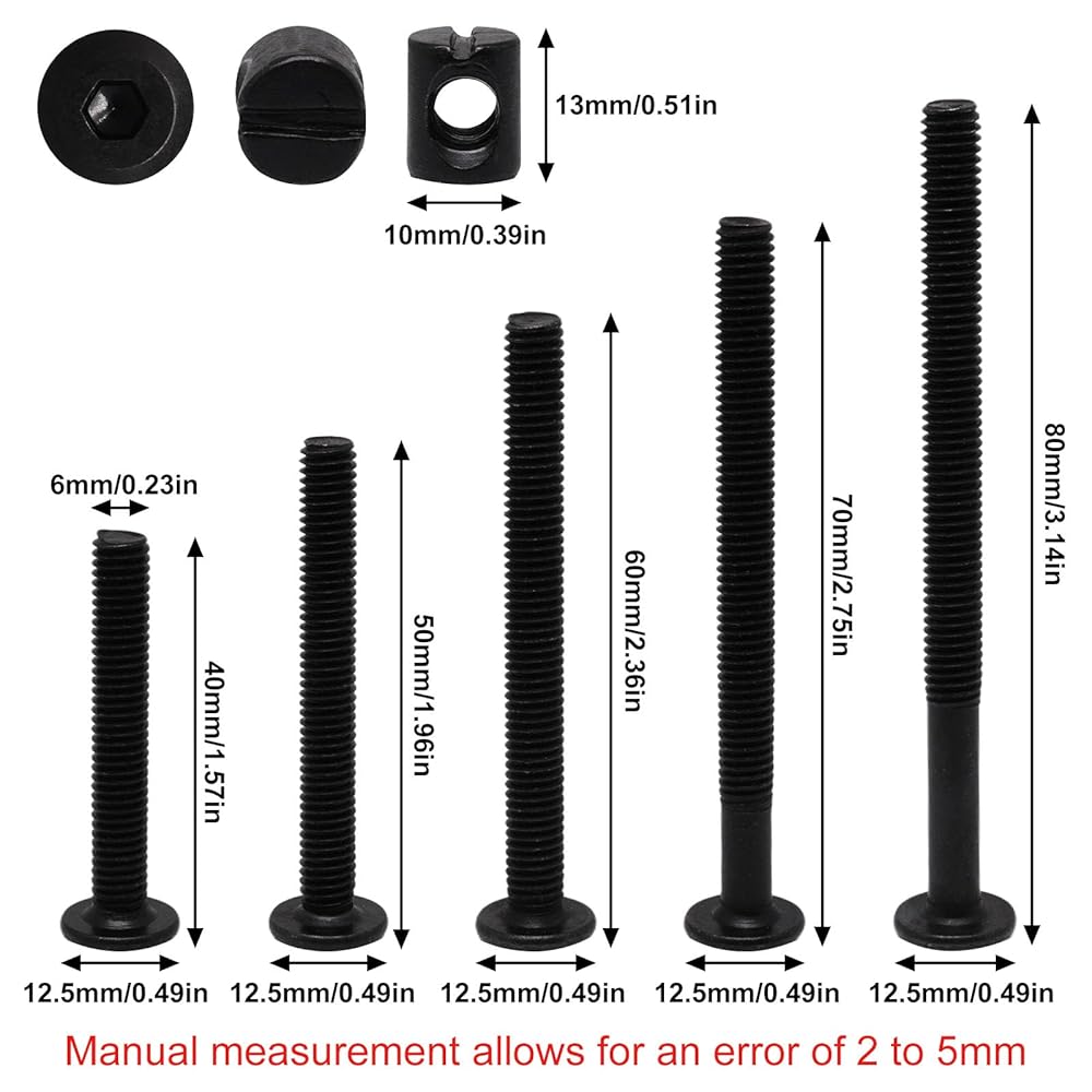 25Set Black Crib Screws Replacement Set Hex Drive Socket Cap Screws Barrel Dowel Nuts Set for Bunk Beds and Cribs M6×40mm/50mm/60mm/70mm/80mm