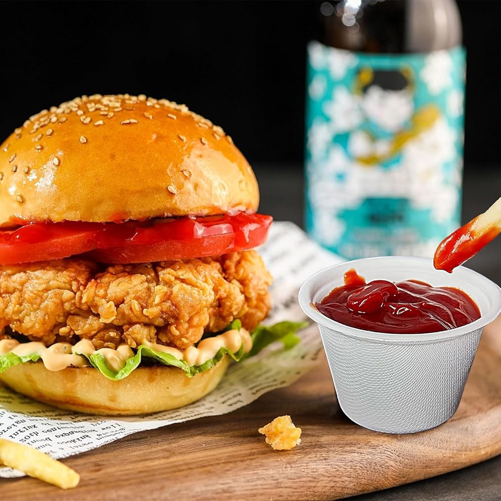 CONVENIENT LIFE:These disposable sauce cups require no dishwashing and can be disposed of in the compost bin after meals, making cleanup a breeze. Ideal for receptions, parties, institutions, food trucks and small fast food restaurants, bringing you added convenience.