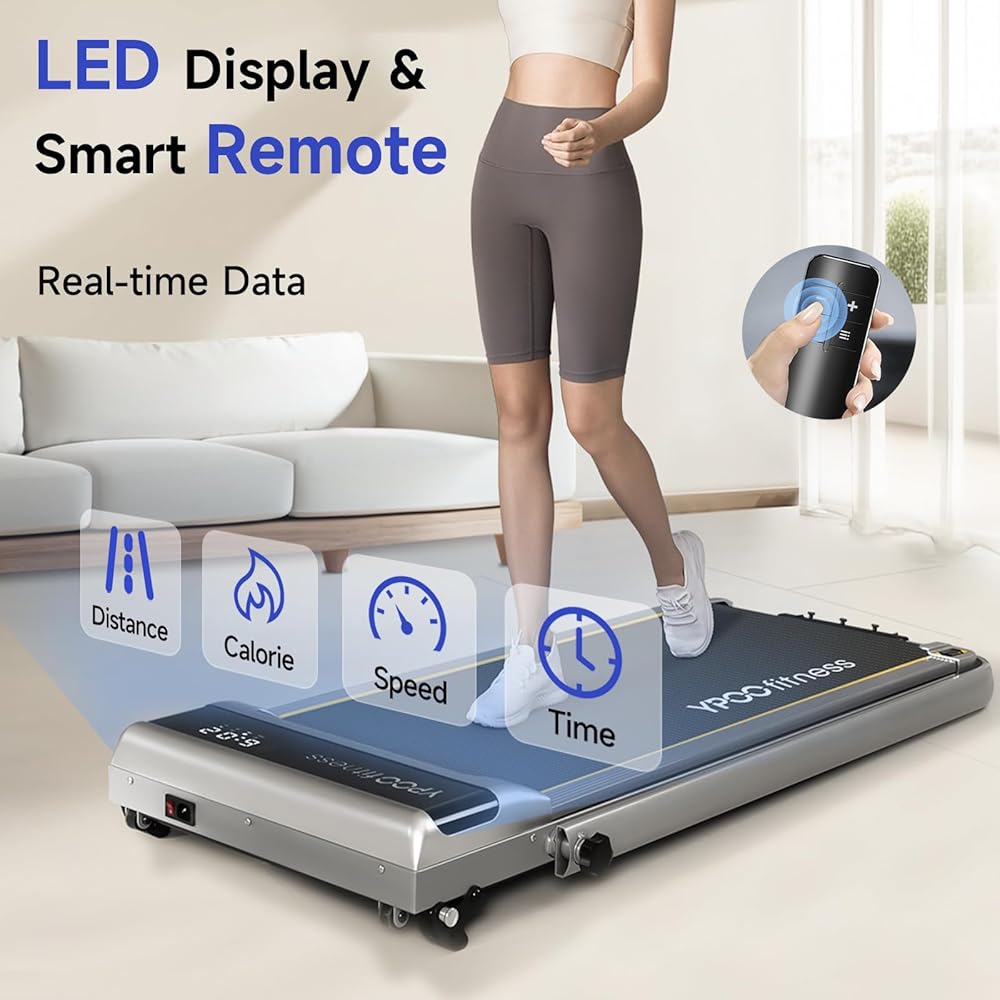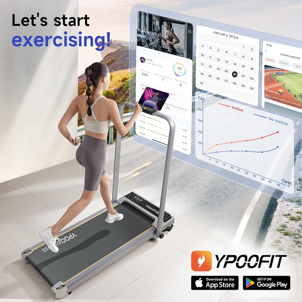 【YPOO Folding Walking Pad with APP】Connect the Ypoofit APP to our foldable treadmill with incline for an interactive workout. Use the phone holder on the portable treadmill to watch videos, and the remote control for easy speed adjustments. Smart Ypoofit APP tracks your progress and connects you with other users, making this walking pad with incline perfect for home fitness.