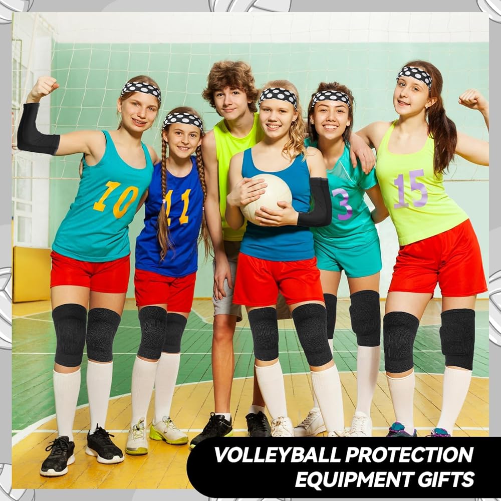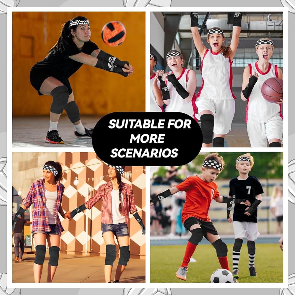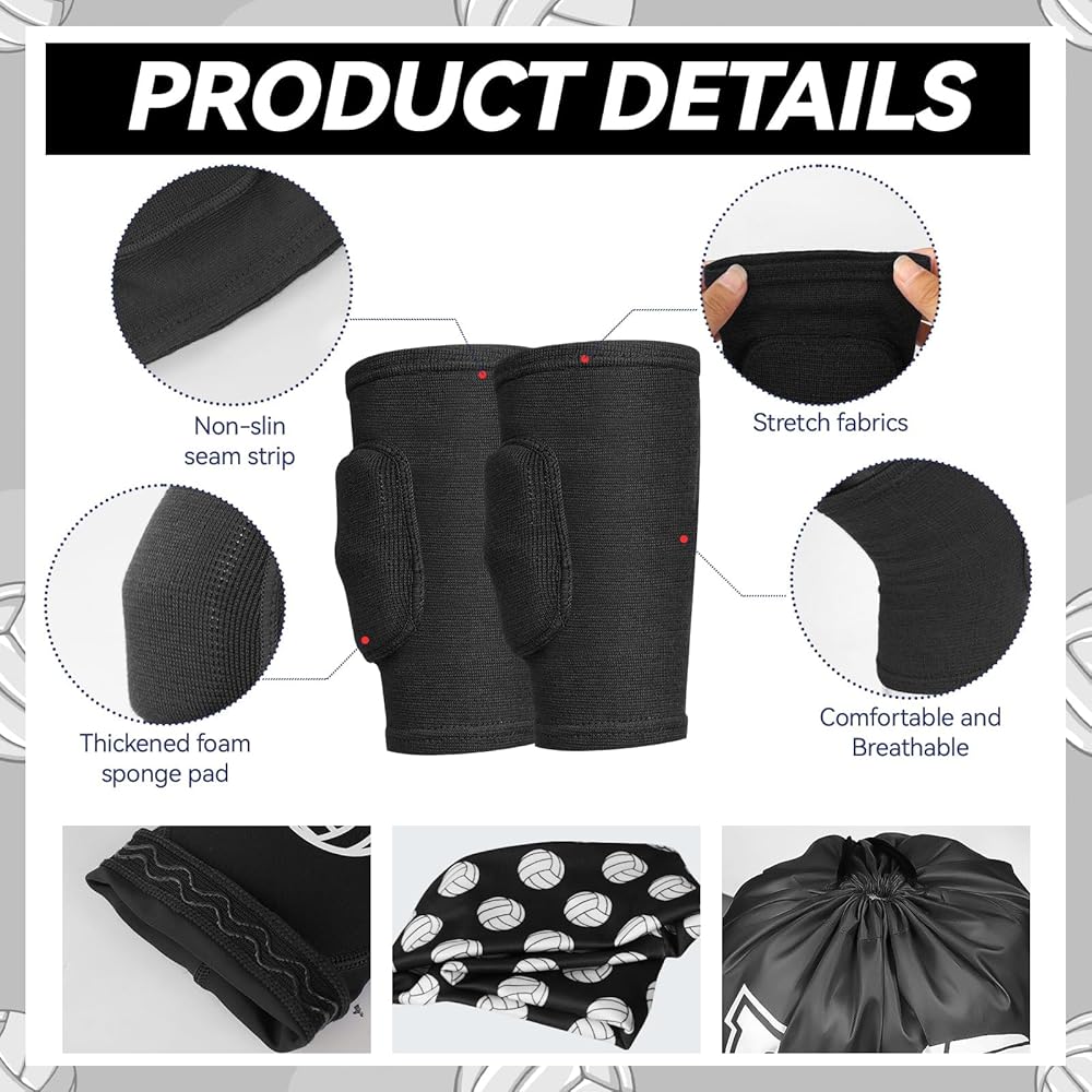 Features: Reduces friction and rubbing: The volleyball knee pads and arm sleeves are designed to reduce friction and rubbing, which are common during volleyball play. This can help prevent skin irritation and abrasions, making your gaming experience more comfortable. Comfortable Experience: These arm pads for volleyball are elastic and comfortable to wear, and can provide cushion for kids' arms during volleyball practice, the sports tie headband can absorb sweat and keep the trainer's forehead dry. Our volleyball accessories are not only suitable for playing volleyball, but also can be applied in other sports such basketball, soccer, football, baseball and so on. Color: Volleyball knee pads: pink,black,blue,white Volleyball arm sleeves: pink,black,blue,white Sweat band: pink,black,blue,white Drawstring bag: pink,black,blue,white Package includes: 1 Pair volleyball arm sleeves 1 Pair volleyball knee pads 1 x Tie headband 1 x Drawstring bag