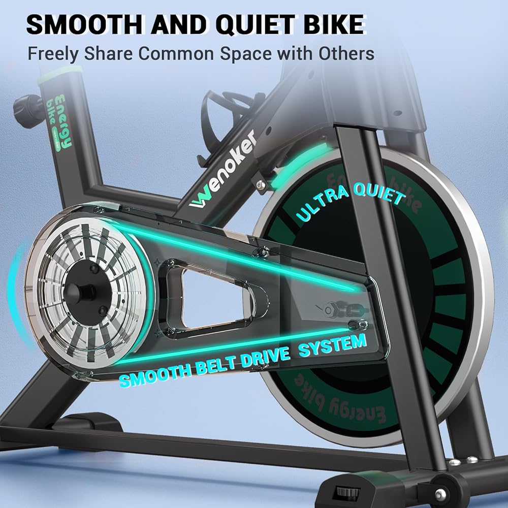 [Quiet As Ever & Smooth] Unlike the deceptive bikes that have a noisy iron sand flywheel, problems of a belt falling off, and pulley breaking, WENOKER exercise bike always adopts an inertia-enhanced flywheel, ABS material belt pulley, and industrial-grade bearings, making the bike more reliable and quieter. The belt drive mechanism offers smooth pedaling and ensures you exercise silently. This means you can use the spin bike in virtually any room of your house.