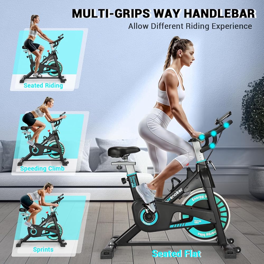 [Sturdy Exercise Bike & Trustworthy Brand] Wenoker is launching a new industry-standard incredibly sturdy, solid frame aluminum steel construction and a sturdy exercise bike that has multi-point handlebar grips providing you with different cycling ways. We offer an exceptional stationary bike that's designed to last and can handle a high user weight of 350 pounds. Its multi-triangle structure and weighted flywheel ensure you are stable and avoid jolting as you ride.