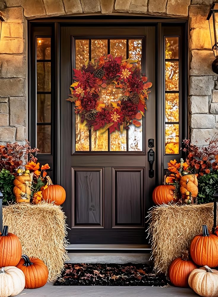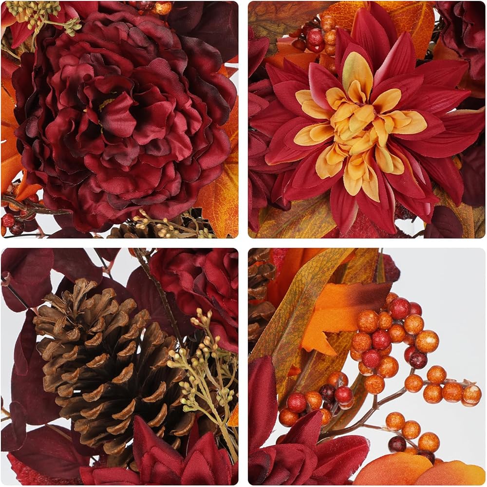 DELICATE AUTUMN ACCENTS: As the sun gently fades and a tranquil stillness fills the air, we welcome yet another enchanting botanical season. Showcase hues of the harvest with the autumn-inspired beauty provided by these colorful artificial fall wreath for front door. Add a touch of autumnal elegance to your home decor with our lifelike harvest wreath in mixed hues