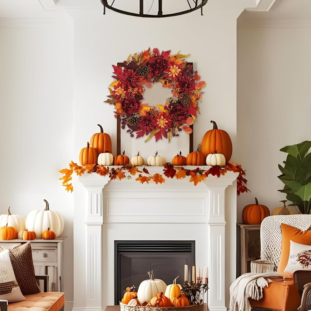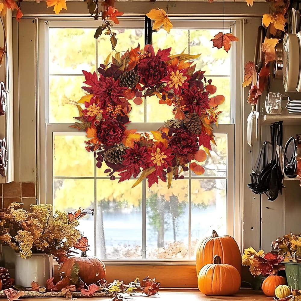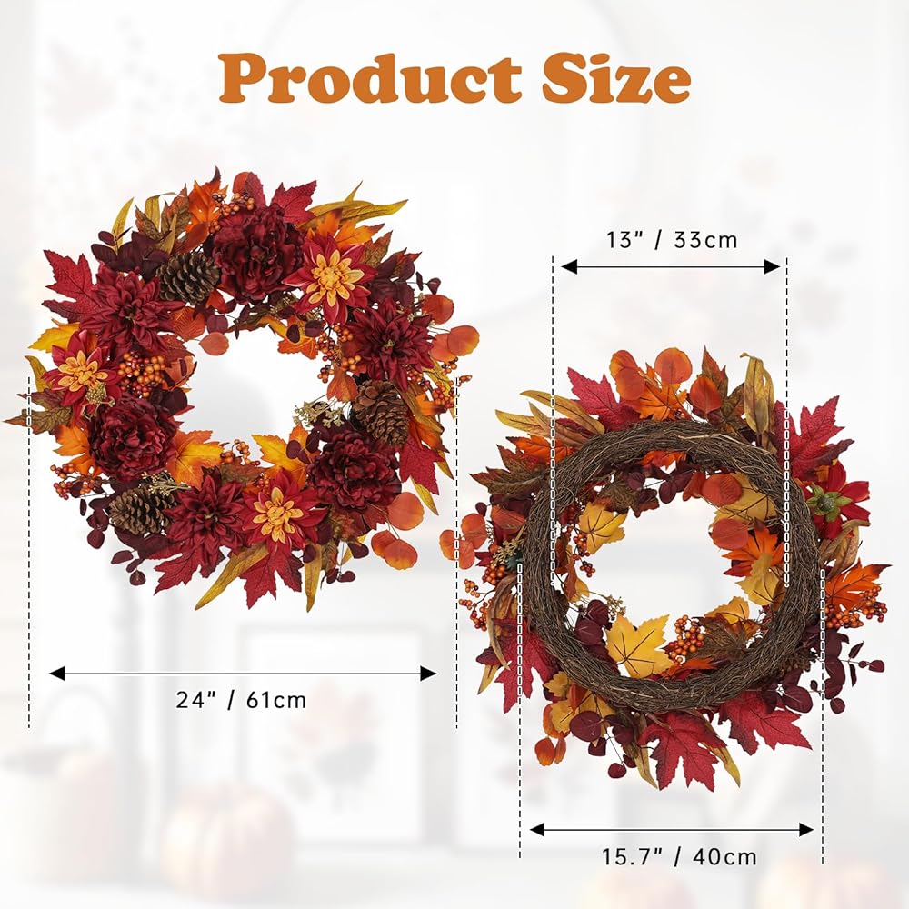 SEASONAL VERSATILITY: Perfect for sprucing up a bare wall or an empty doorway, this 24 inch decorative wreath would undoubtedly make for an eye-catching accent wherever displayed. Ideal for autumn and Thanksgiving, this wreath embodies the spirit of the season, making your home festive and inviting for family and guests alike