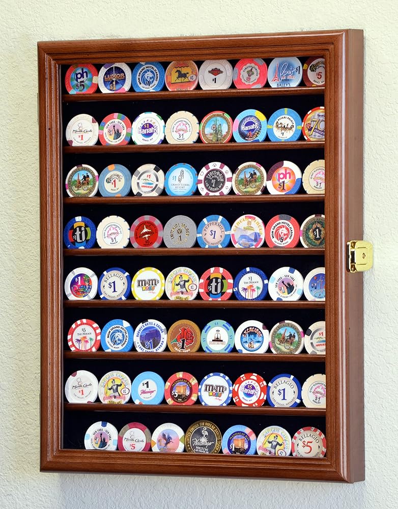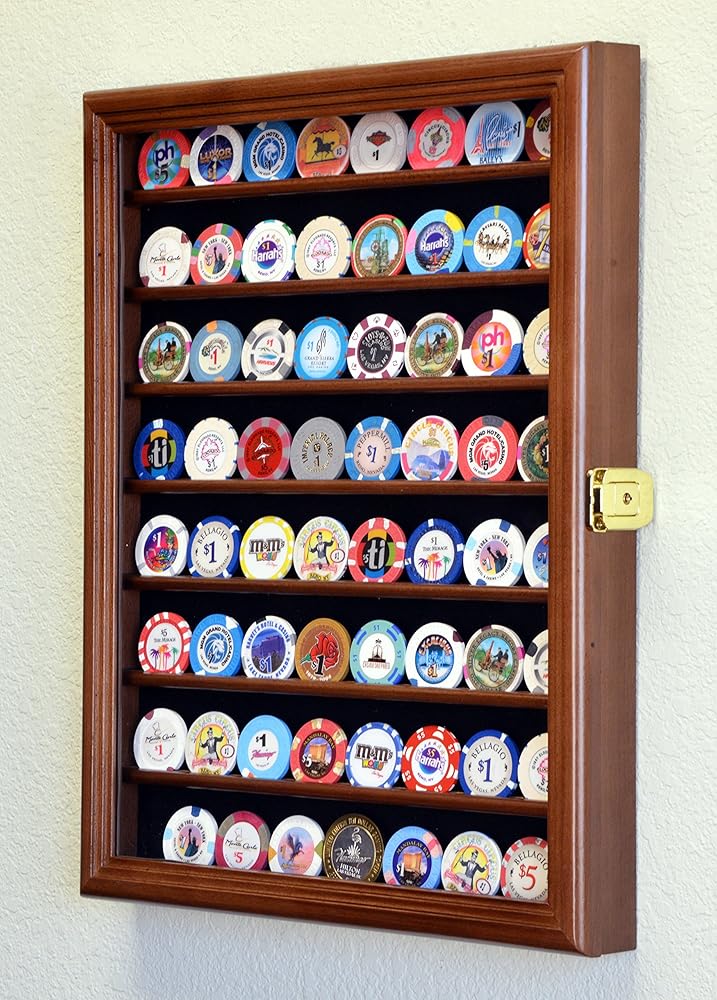 Perfect way to display your memorable coins that you have collected. This case can display up to a total of 64 standard size casino chip coins. A total of 8 shelves with up to 8 coins on each row. A smooth acid free felt fabric background creates a stunning background for your coins.