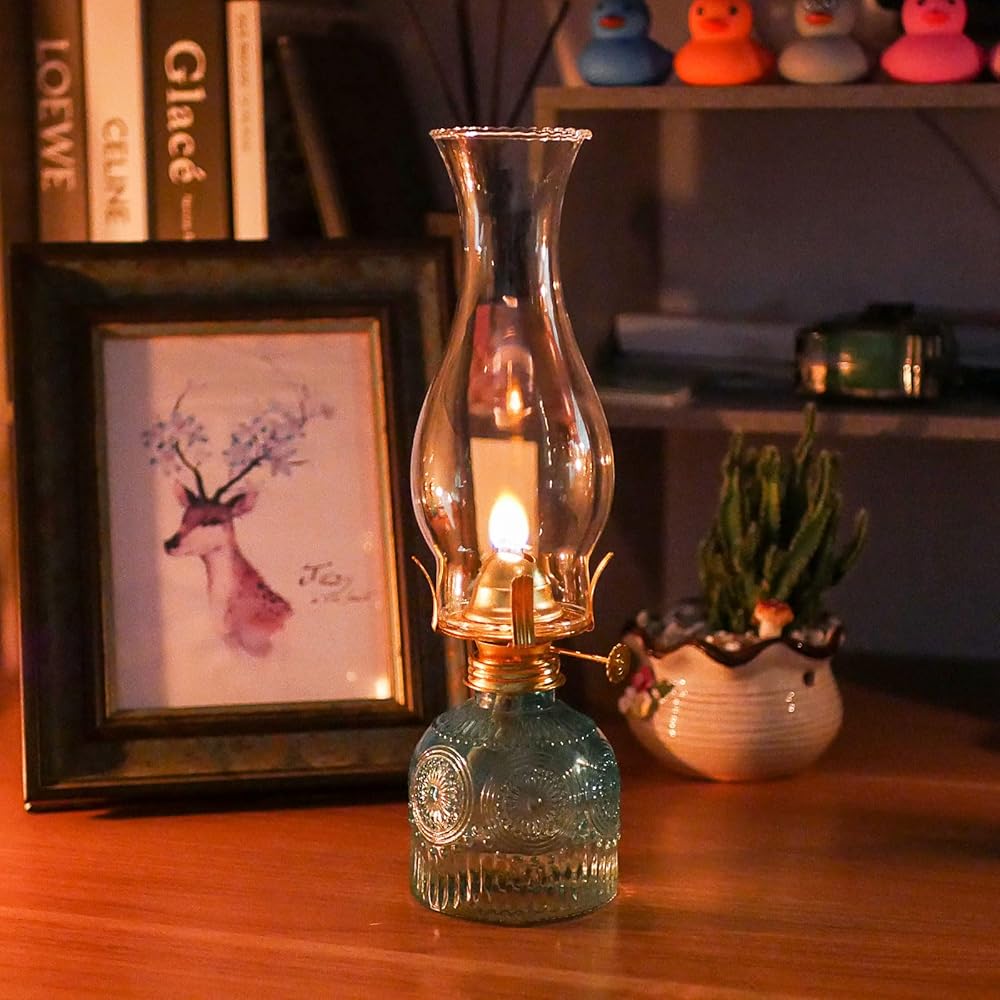 2-PK Oil Lamp - you will receive 2 pieces large chamber oil lamp, each composed of a windproof glass chimney, a glass lamp holder and a metal flame regulator, equipped with 2 wicks, vintage and beautiful, retro cute style suitable for desktop decoration, this decorative hurricane lamp will light up your home decoration.