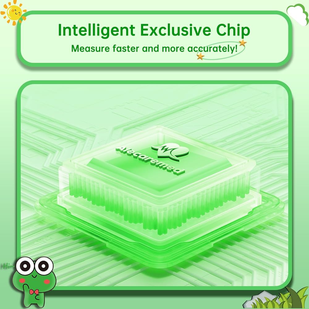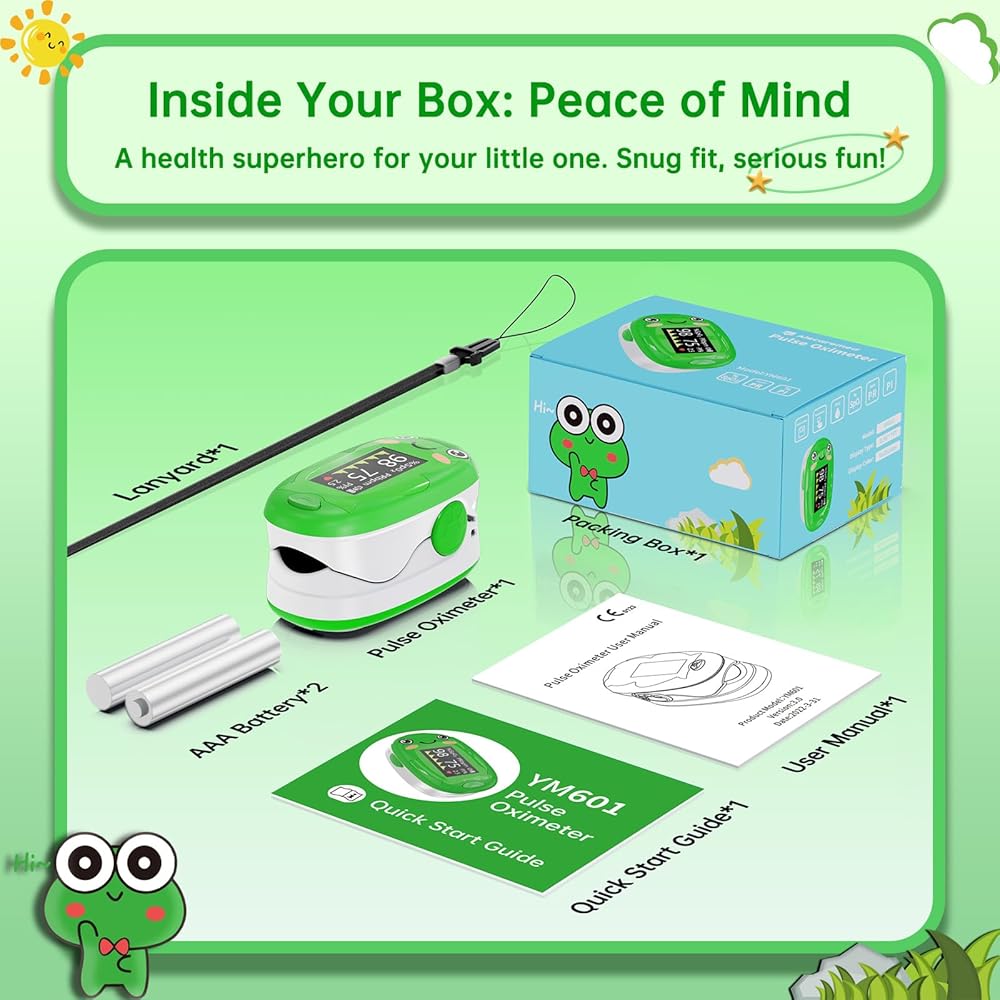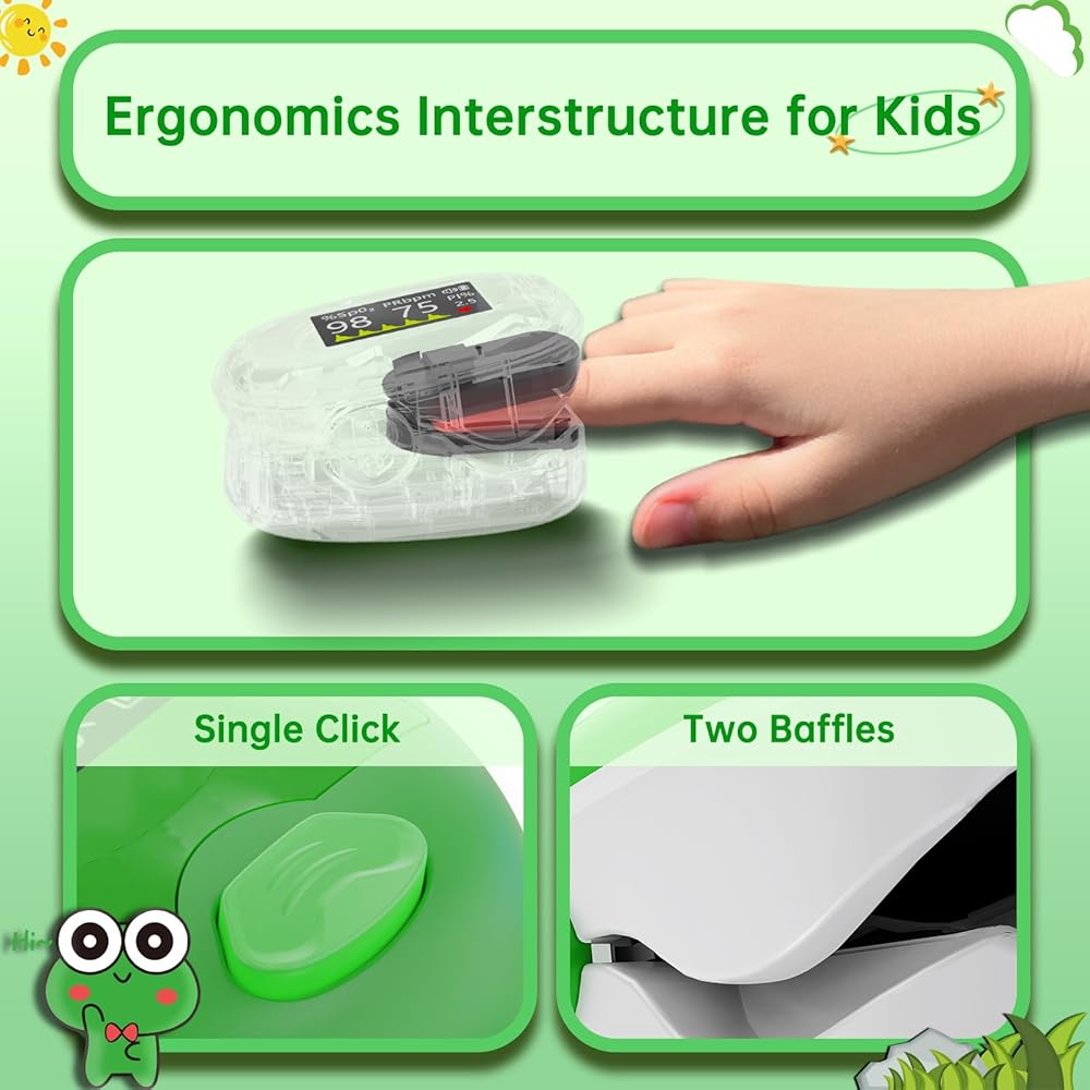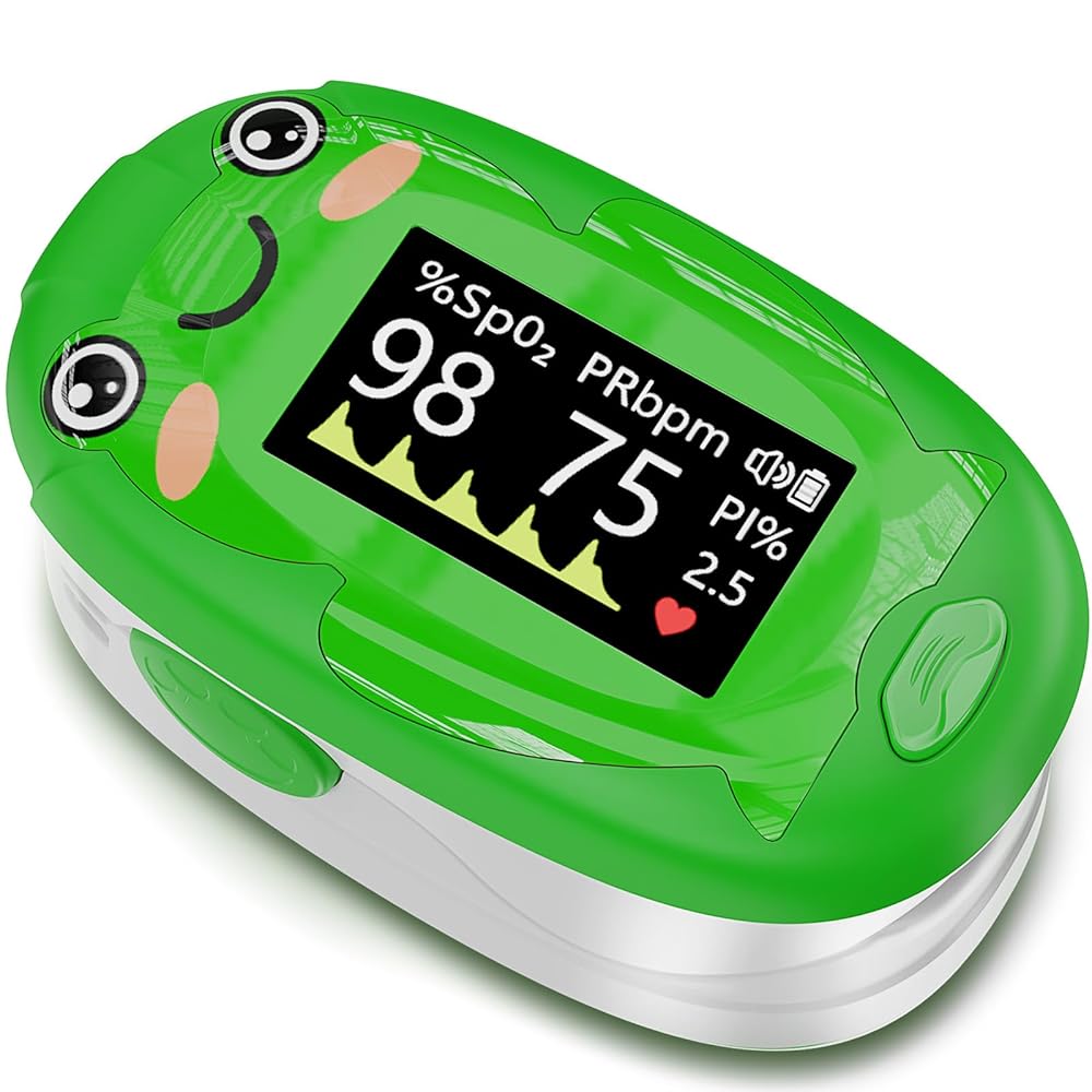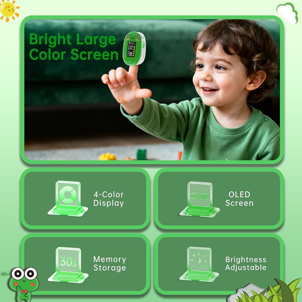 Pulse Oximeter for Kids, Adorable Animal Children Oxygen Monitor Fingertip with 20 × Memory, 4 Color OLED Display Blood Oxygen Saturation Monitor with Alarm, Batteries and Lanyard (Green)