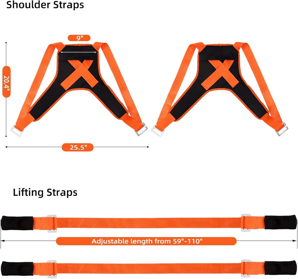 Adjustable Appliance Moving Straps: Each polypropylene strap is made from two durable 0.8 in wide woven bands. The back strap length can be adjusted freely between 59-110 in. In addition, 5.9 in and 9.4 in spongy pads were added to the friction points on the arms and shoulders of the nylon straps to ensure safety during handling. Compared to other furniture moving kits, Ounan furniture lifting straps have a sponge pad (9.8 in) added to the back to protect your spine.
