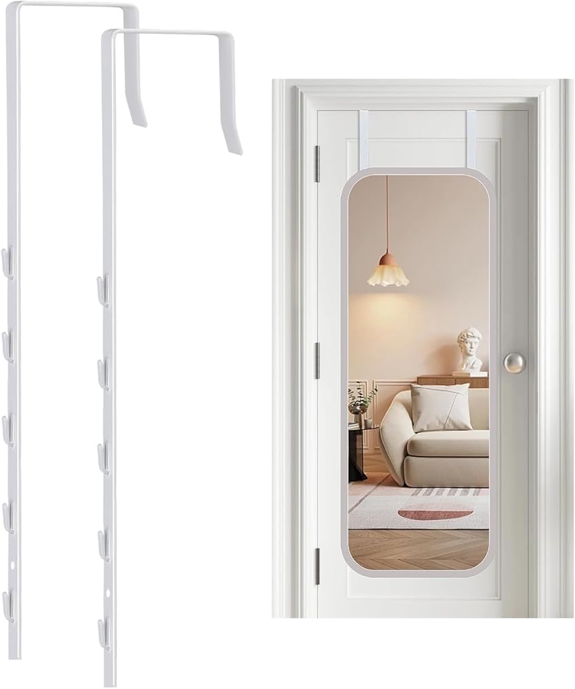 Over-The-Door Mirror Hanger, Adjustable 13.6 in Door Mirror Hanger with Protective Lining, Prevent Scratches, 2 Pcs Mirror Brackets Perfect Height and Fit (Mirror Not Included) - White