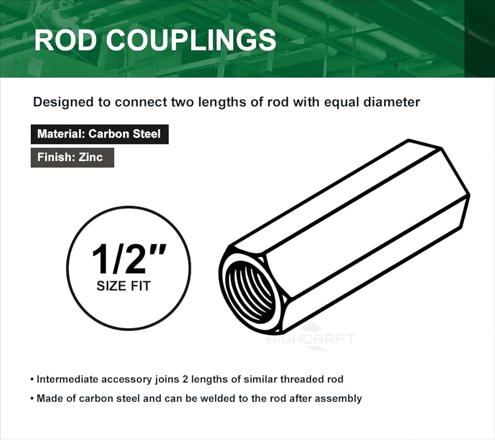 Highcraft DSP-A34 Rod Coupling Nuts 1/2-Inch Diameter by 1-1/2-Inch Length, Zinc Plated, 50 Pack