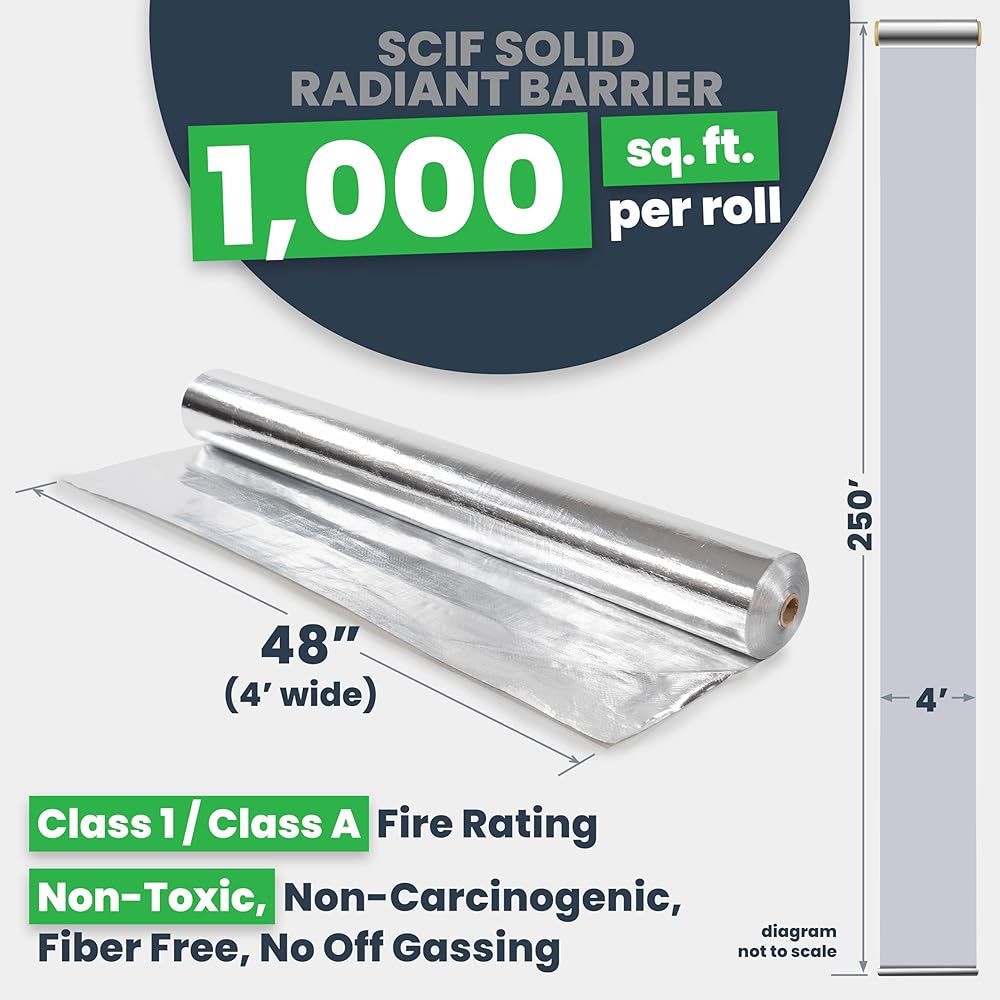 EcoFoil's Ultra NT Solid Radiant Barrier is designed for Sensitive Compartmented Information Facilities (SCIFs), and acts as an RF attenuation barrier that blocks radio frequencies. One roll of solid SCIF barrier measures 4 ft. wide and 125 ft. long for a total of 500 sq ft. Ultra NT Radiant Barrier is effective for securing confidential information and keeps data secure from outside threats. The SCIF foil is made of woven polyethylene sheet bonded between two highly reflective, tear-proof aluminum foil surfaces. When seams are sealed, the radiant barrier insulation roll doubles as an effective vapor barrier to keep out moisture and reduce condensation buildup. Installation: Use scissors or sharp utility knife to cut the SCIF insulation to size and use SCIF tape to seal the seams. If attaching SCIF barrier to wood framing - use a staple gun and 3/8" wide construction staples. If attaching it to concrete and steel - refer to engineering specs to adhere to the wall. Recommended use: use on walls, floors, and ceilings of government and military security, data centers, research/medical/computer labs, broadcasting studios, business meeting rooms, home offices, and other ICD 705 certified projects. Although used for SCIF rooms, you can use this insulation type if you have high sensitivity to cell phone signals or live close to a tower. Whether you're a professional SCIF contractor or DIYer, make sure to stock up on some high-quality reflective radiant barrier like the Ultra NT SCIF Solid from EcoFoil.