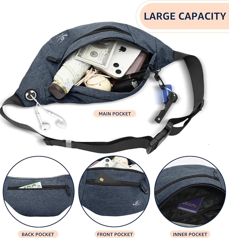 Spacious and Organized Design: Featuring a large size with dimensions of approximately 14" x 6", this fanny pack has four meticulously designed zippered pockets. Whether it's your phone, wallet, keys, passport, or other small items, everything fits easily inside. This fanny pack offers perfect organization and convenience for your daily life and travels, helping you stay clutter-free.
