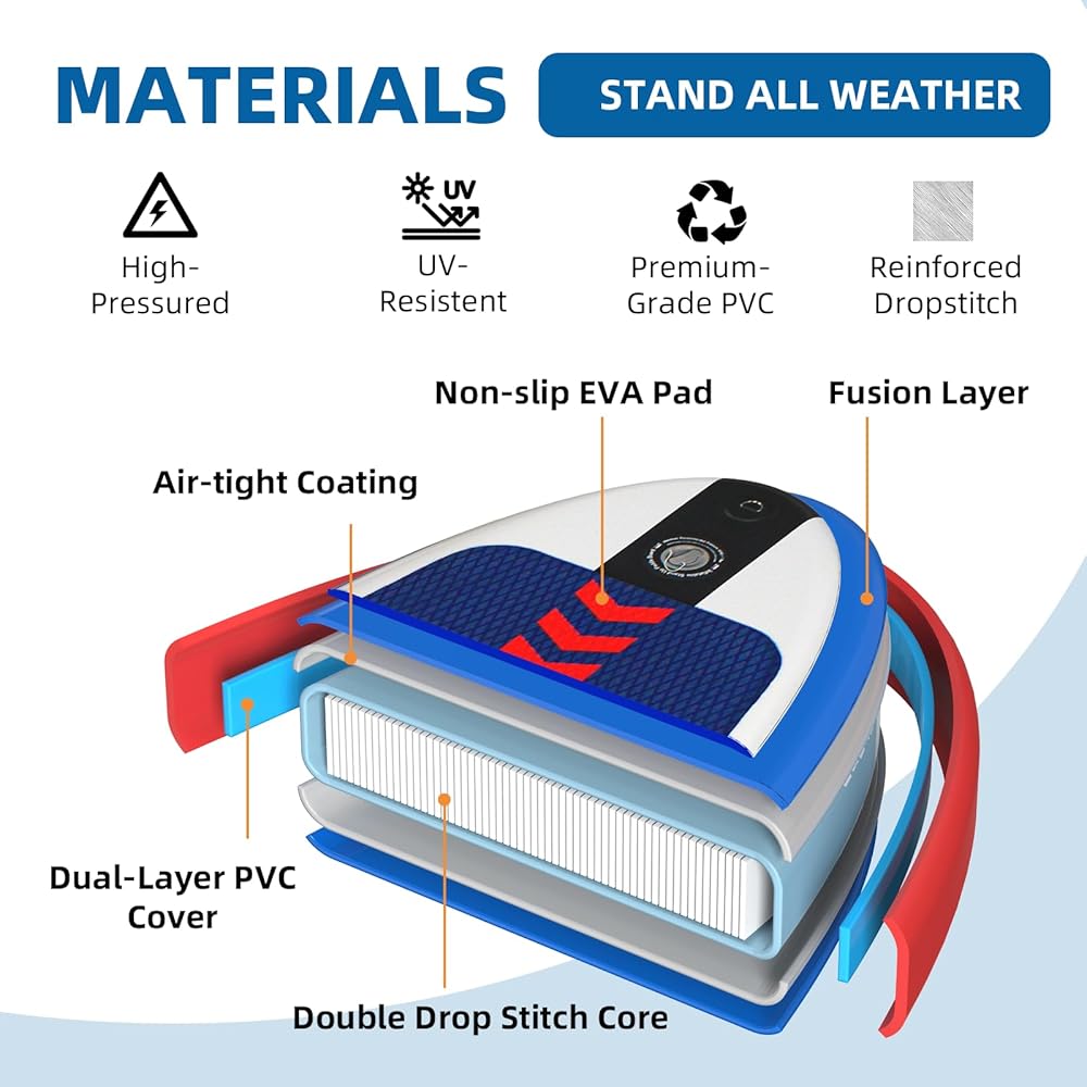 - High-Quality Material: Our stand up paddle board made from highest quality material, ensuring a durable and lightweight board. The non-slip soft deck minimizes accidents and injuries, making it ideal for beginners and experienced paddlers.