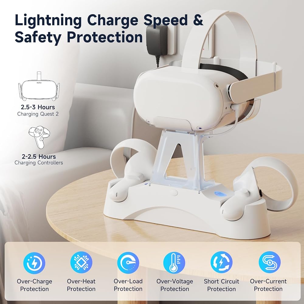 【Lightning Fast Charging】 - Bulid in 2×1800mAh large capacity rechargeable batteries,fully charge your VR headset in 3 hours and touch controllers in 2.5 hours.Longer play time, can be used for about 36hours of vr game playing after full charging. And it can be recharged up to 2000+ times.