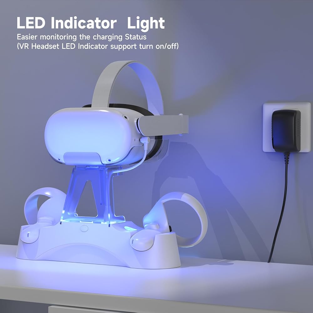 【Convenient LED Indicators】The vr charger oculus quest 2 is designed with LED lights (Manual Turn on/off)in the support column and on the left and right sides of the base to indicate the charging status of the docked headset and controllers. It's easy to tell when your accessories are charged: red while charging, and blue when fully powered.