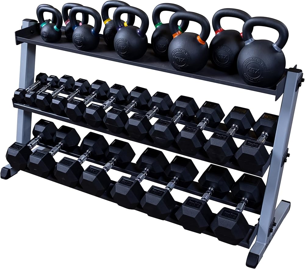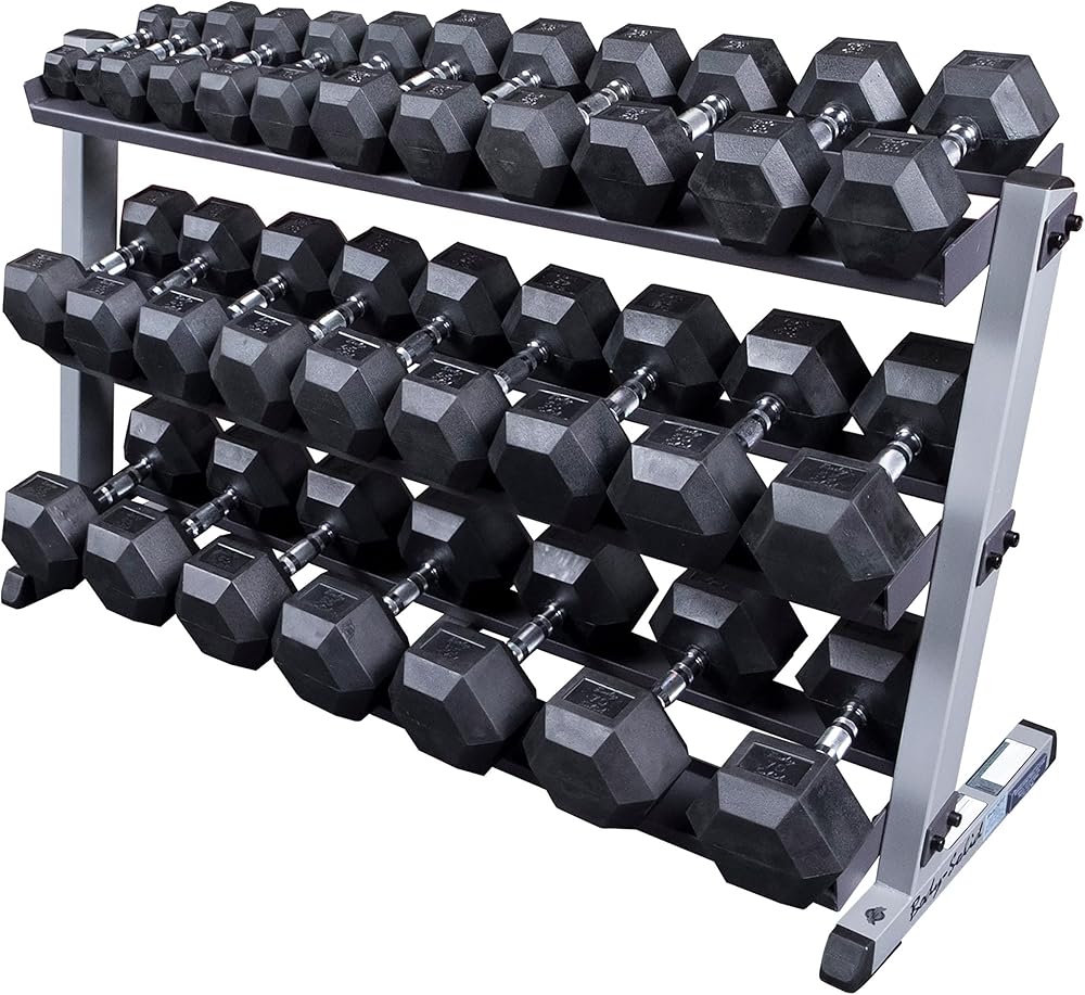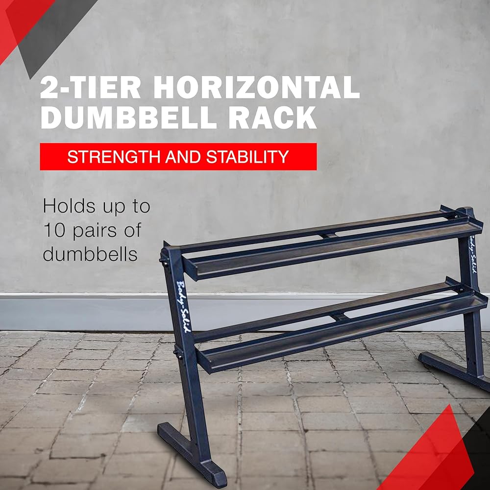 Keep your entire set of Body-Solid hex dumbbells secure, organized, and close at hand during your workout with the Body-Solid 2-Tier Horizontal Dumbbell Rack (GDR60). This weight stand is designed to hold an entire set of vinyl or neoprene dumbbells pairs between 5 and 50 pounds, offering a simple storage solution for your free weight collection. The dumbbell stand is made with heavy-gauge steel. The tubing is welded on all four sides and the metal is de-burred inside and out for user safety. The sturdy, space-efficient design is safe to be placed against a wall or freestanding in the center of a weight room. When assembled, the Body-Solid Tools 2-Tier Horizontal Dumbbell Rack equipment measures 23 by 62 by 32 inches (L x W x H) with a 56-inch tray availability and a weight of 79 pounds. It is backed by the Body-Solid Lifetime In-Home Warranty, which fully covers all parts of the dumbbell rack for as long as you own it. Use this weight storage rack with Body-Solid Cast Iron Hex Dumbbells (SDX) or Rubber Coated Hex Dumbbells (SDR) and expand it with an optional third tier (GDRT6) that allows storage up to 70 pounds. Body-Solid sets the standard for workout equipment.