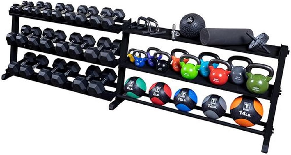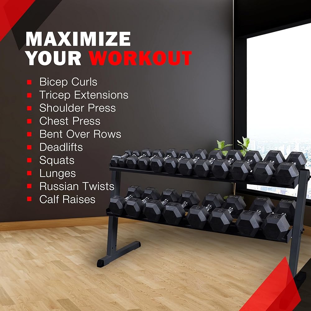 The rack holds a full set of one pair each five-to-50-pound hex dumbbells, and a heavy-duty, two-by-three-inch (W x D) steel tubing mainframe has a reversed pitch deign, allowing easy access to each tier. An optional third tier, sold separately, provides even more storage on the 62-by-32-by-23-inch (W x H x D) rack.