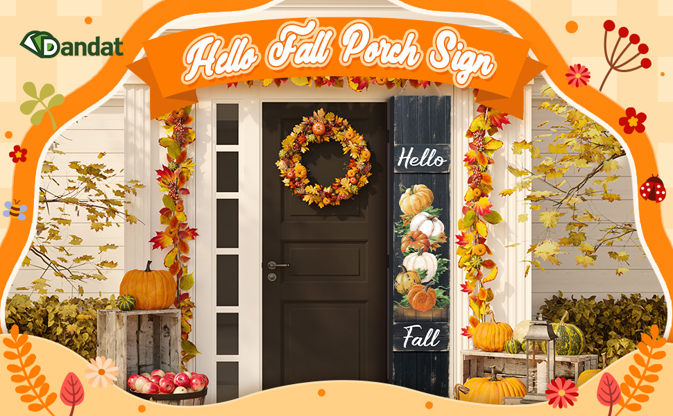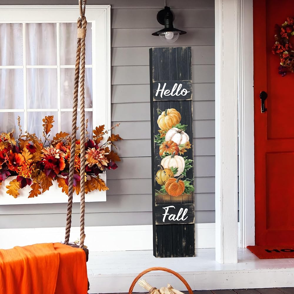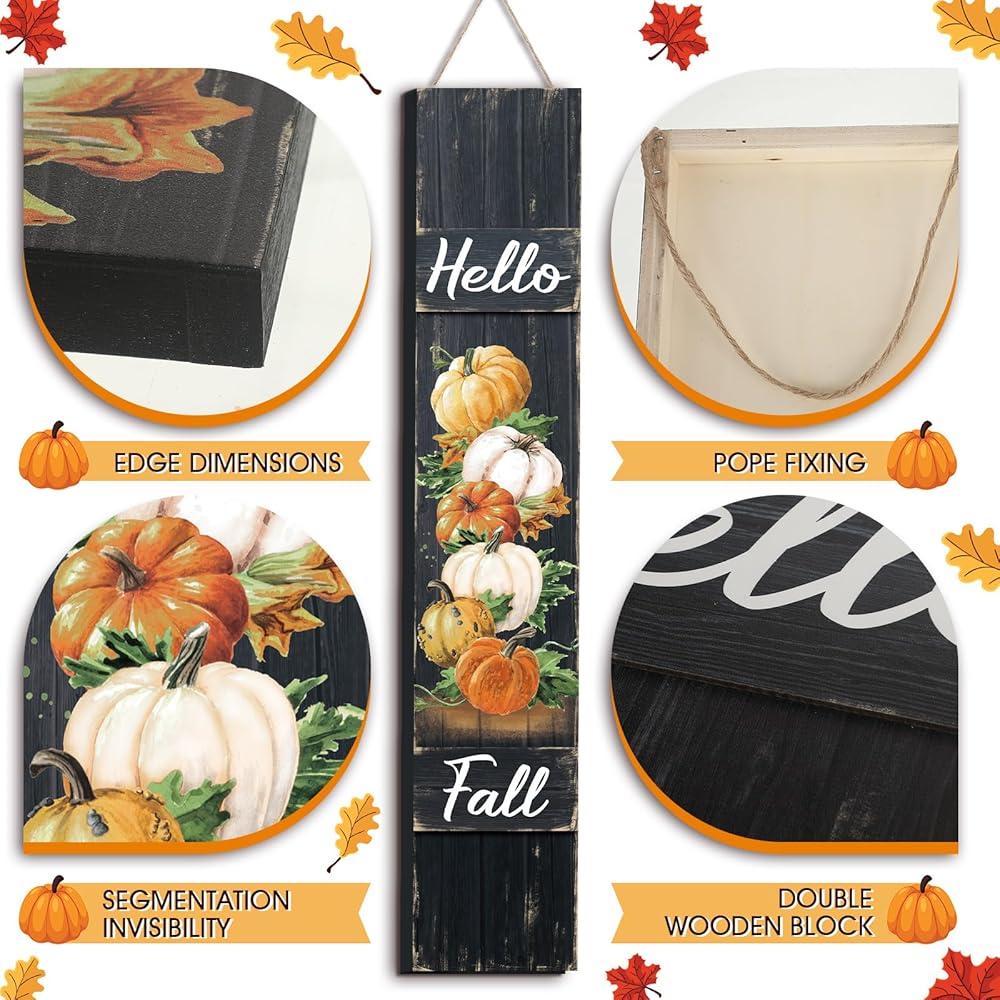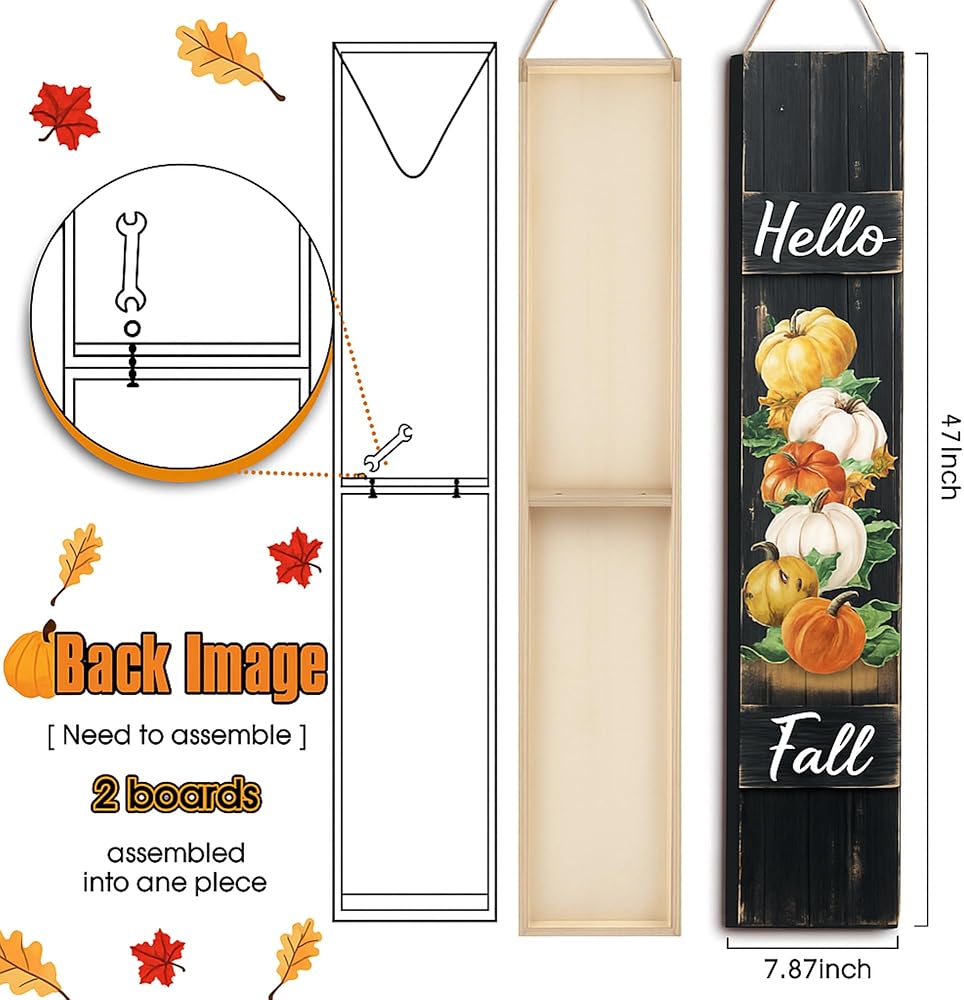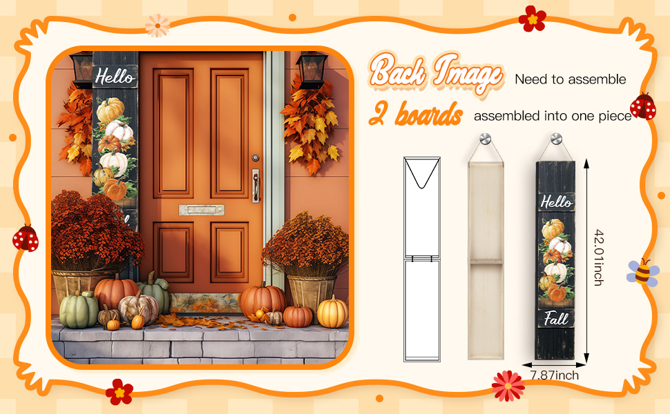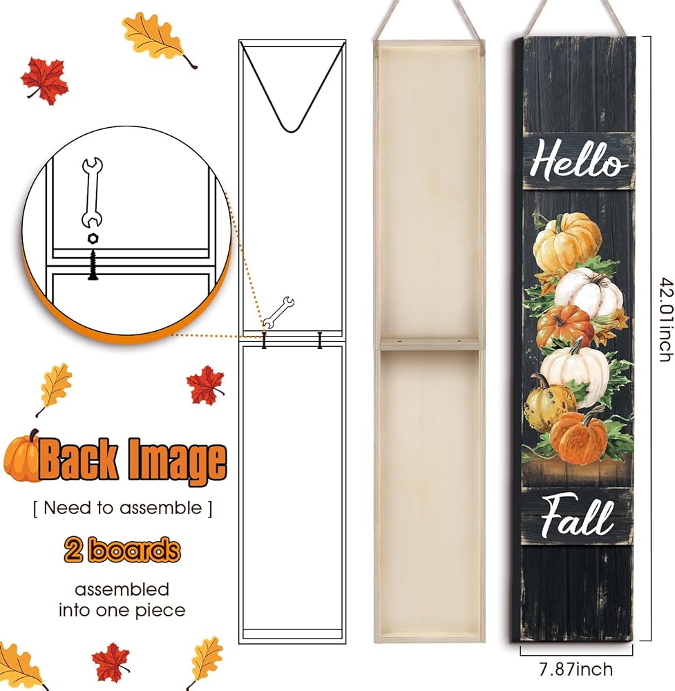Size and Color: with a height of about 42.01 inches/ 106.71 cm, a width of about 7.87 inches/ 19.99 cm, a thickness of about 0.4 inch/ 1.02 cm, each part of about 7.87 x 21 inches/ 19.99 x 53.34 cm, this porch sign wooden is the suitable size to be seen from afar; Its bright orange pumpkins and 'HELLO" and "FALL" letters will make an eye catching statement