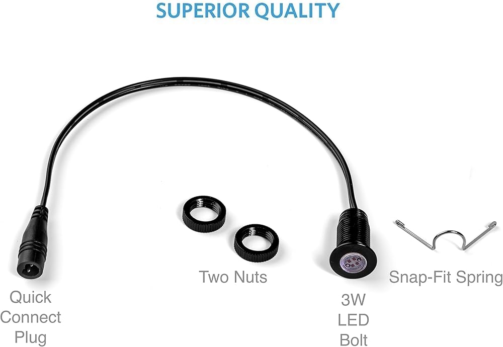 TWO MOUNTING OPTIONS: You can either use the snap-fit springs, or the nuts. Both are included. The bright marine LED bolts sit flush in your boat for a discreet hidden appearance.