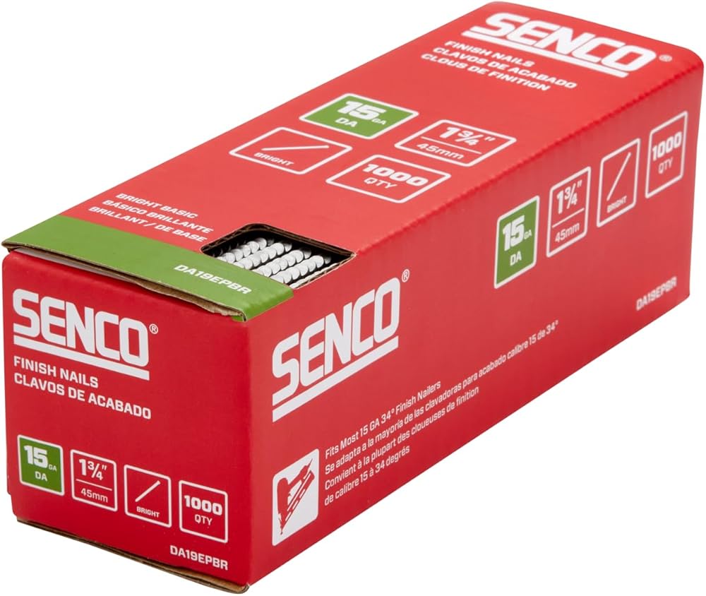 The SENCO DA19EABR Angled Finish Nails are 1-3/4" long 15 Gauge fasteners with a Galvanized Finish. These fasteners come in a 1,000 Count Pack. Applicable to furniture and cabinets, molding and trim, baseboard, chair rails, doors and window casings substrates.