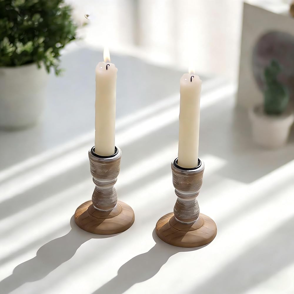 【Perfect Fit】Designed for standard taper candles, these candlesticks holders measure 3.54" in height with a 0.87" candle hole diameter and 2.76" base diameter. With 2 vintage wooden candlestick holders in each set, these make a perfect addition to your home decor. Candles not included.