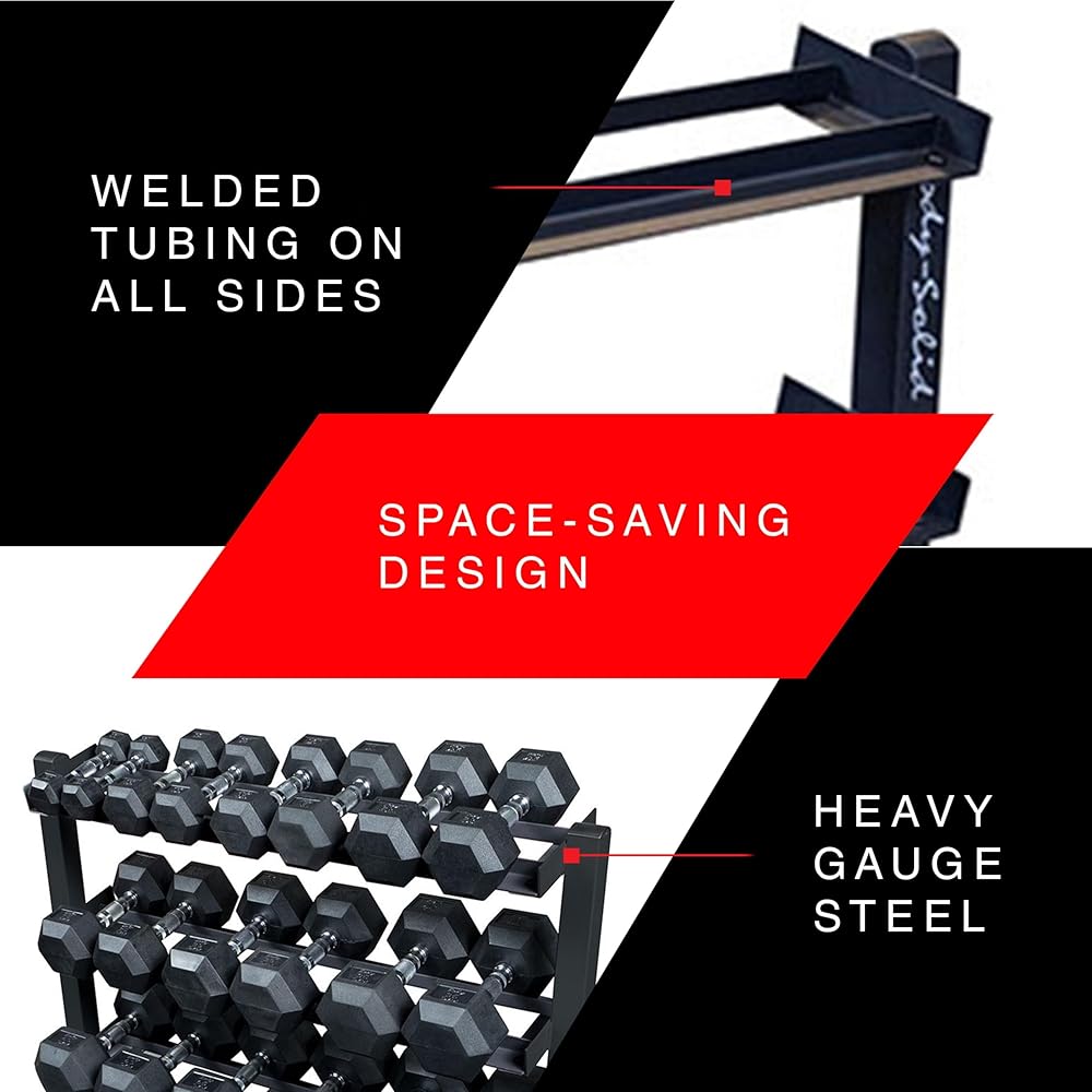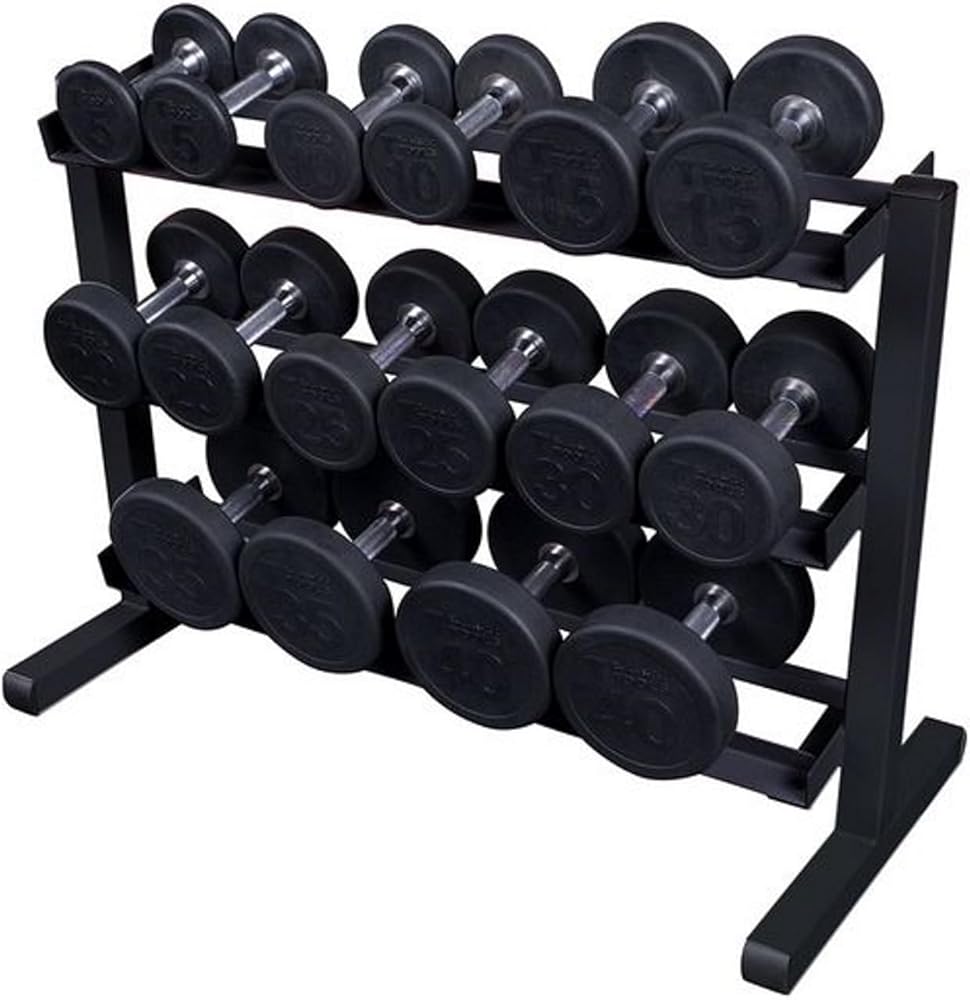 Keep your entire set of Body-Solid hex dumbbells secure, organized, and close at hand during your workout with the Body-Solid Three-Tier Horizontal Dumbbell Rack (GDR363). This weight stand is designed to hold 10 pairs hex dumbbells between 5 and 50 pounds, offering a simple storage solution for your free weight collection. The dumbbell stand is made with heavy-gauge steel. The tubing is welded on all four sides and the metal is de-burred inside and out for user safety. The sturdy, space-efficient design is safe to be placed against a wall or freestanding in the center of a weight room. When assembled, the Body-Solid Tools Three-Tier Horizontal Dumbbell Rack measures 40 by 20 by 30 inches (L x W x H) and weighs 44 pounds. It is backed by the Body-Solid Lifetime In-Home , which fully covers all parts of the dumbbell rack for as long as you own it. Use this weight storage rack with Body-Solid Cast Iron Hex Dumbbells (SDX) or Rubber Coated Hex Dumbbells (SDR).