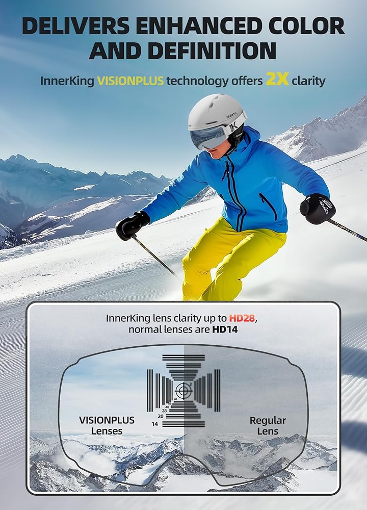 UV PROTECTION & ANTI-FOG: Double lens design, polycarbonate outer surface with ultra-high definition mirror effect. Anti-scratch, anti-fog, anti-impact, full-face mirror-coated reflective lenses, 100% UV protection, more durable than other snow goggles. The inner lens is made of Italian professional long-lasting anti-fogging material with a ventilation system. No fogging while skiing. Cylindrical lens design with excellent optical clarity for an ultra-wide field of view.
