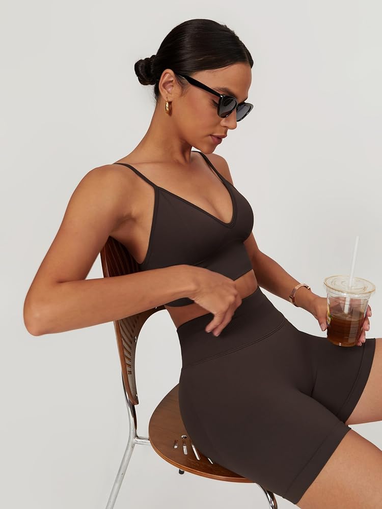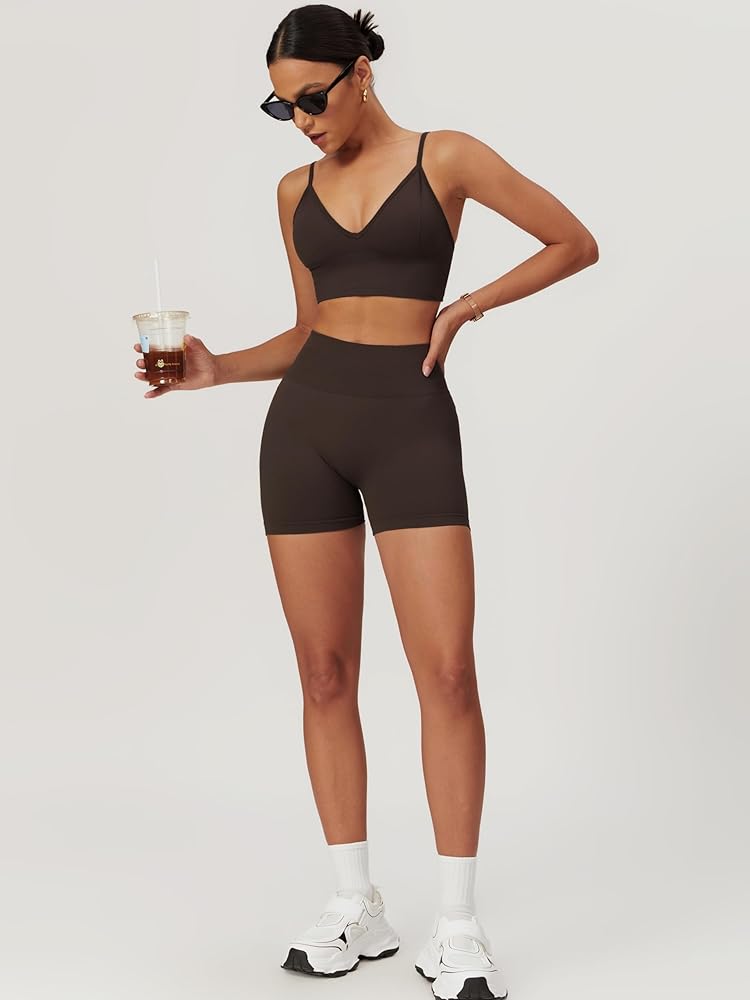 V Neck Sports Bras for Women Two piece workout sets for women shorts sets, women's seamless sports bras, v neck, removable padded cups, this sports bra is crafted from seamless knit fabric with moisture-wicking and breathable properties. It features adjustable straps for a custom fit, as well as contoured cups and a micro-rib elasticated underband for enhanced support and lift.
