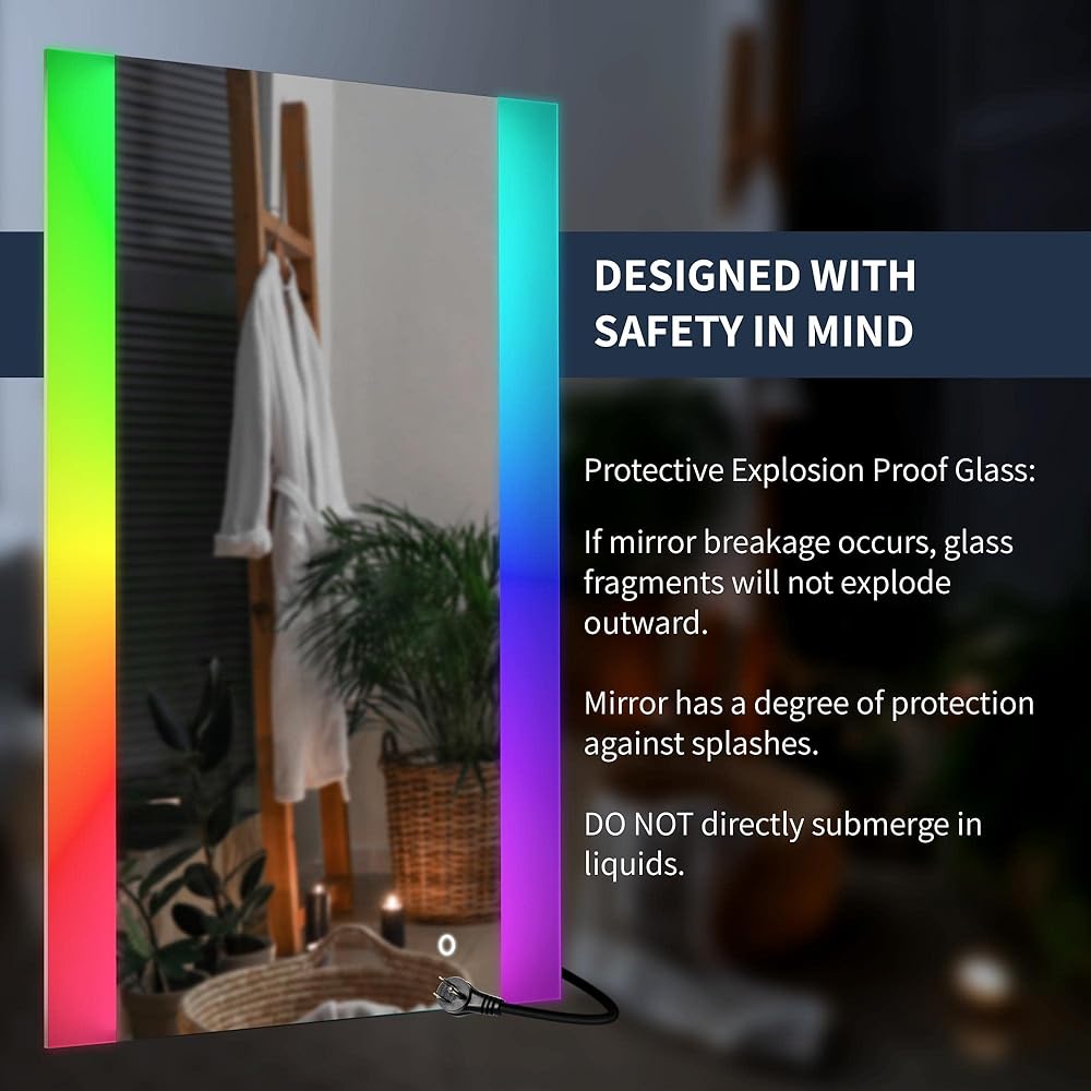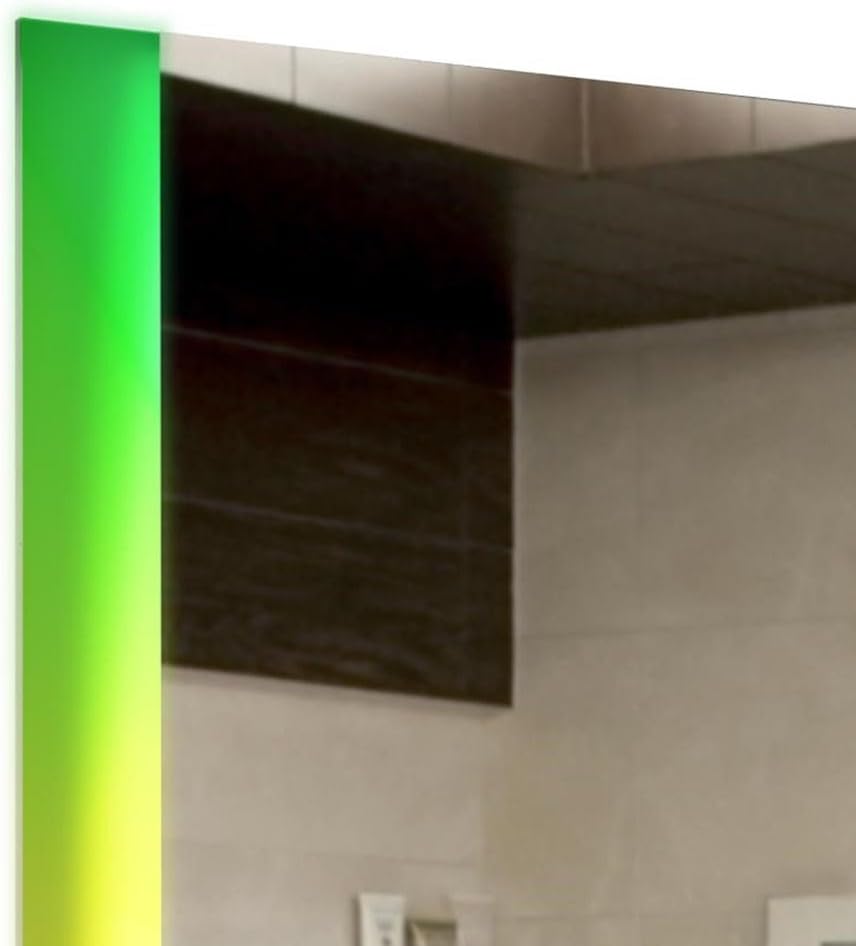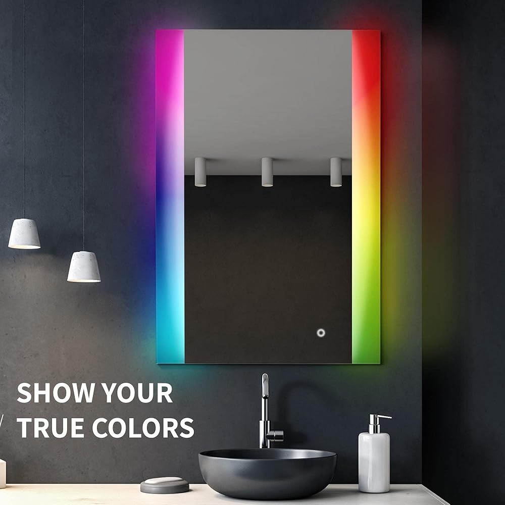 Set the mood and impress your guests with our unique RGB LED mirror. This thoughtfully designed, statement piece cycles through all the colors of the rainbow plus white, illuminating any bedroom, bar, game room, or basement with a fun ambiant lighting to help set the scene for whatever the day calls for. You can easily change the ambient lighting and cycle through every color imaginable with the touchof the on mirror button, the included remote or control through the app. Each mirror comes with an sleek on/off touch sensor flush with the mirror, remote to switch between the colors, and precision-cut LED light panels, resulting in a piece as functional as it is stylish.