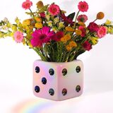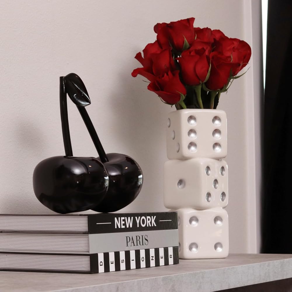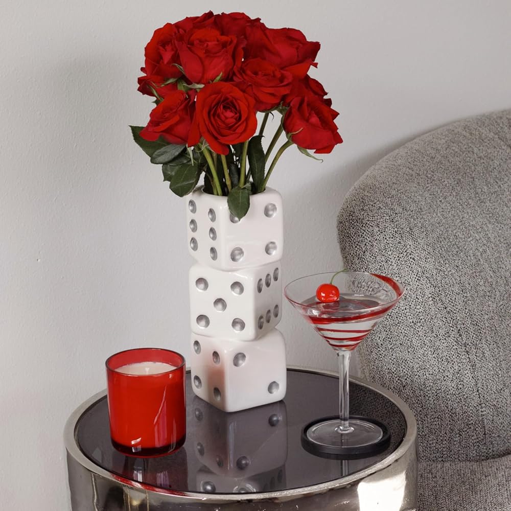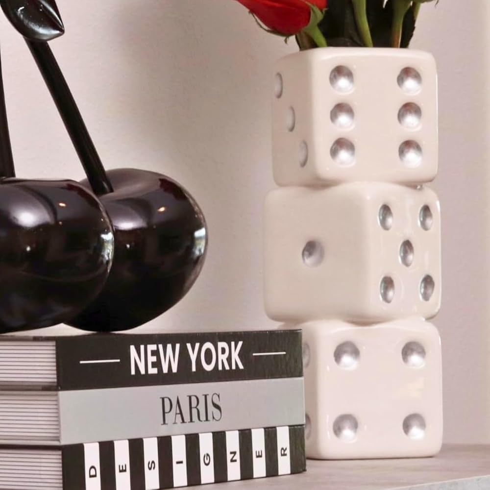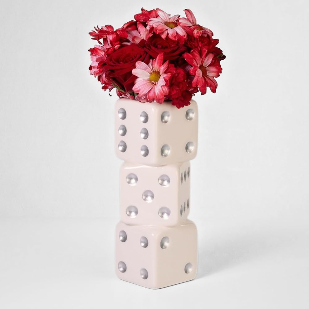 Reimagine Discovery Triple Dice Vase – a funky and maximalist ceramic flower vase that adds a touch of retro charm to your space. Standing three dice tall, this unique vase boasts a wide mouth, allowing for creative styling on your desk, shelf, table, bar cart, or vanity. Shake up your interior design with its ceramic dice magic, creating a funky and trendy aesthetic for your bedroom, office, or entryway. Perfect for a casino royale party or any celebration, our Dice decor adds a playful touch to bachelor, bachelorette, bat mitzvah, bar mitzvah, game night, and beyond. This larger-than-life vase is not just a decoration but a statement piece that catches everyone's eye. Designed in the USA by RD Home USA's expert team in collaboration with exclusive ceramic manufacturers, our Triple Dice Vase is a timeless and unique gift for yourself or loved ones. Join Reimagine Discovery in transcending basic home decor and elevating your space with cool, trendy, and aesthetic room decor that reflects your individual style.