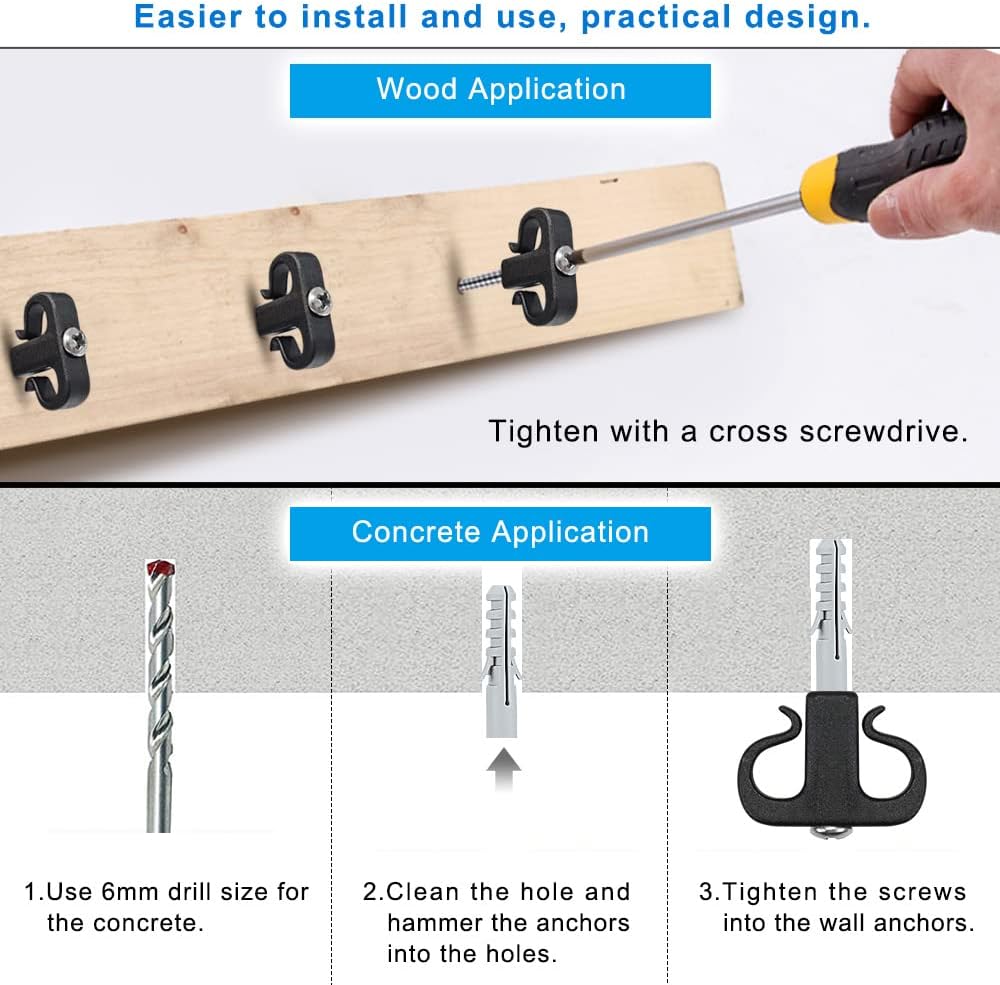 【EASY INSTALLATION AND REMOVAL】These hooks are quick and easy to install. You can tap them directly into the wood with a hammer or screw them into the wood with a screwdriver. They also have a safety buckle design that allows you to easily release the wire or string without damaging it.