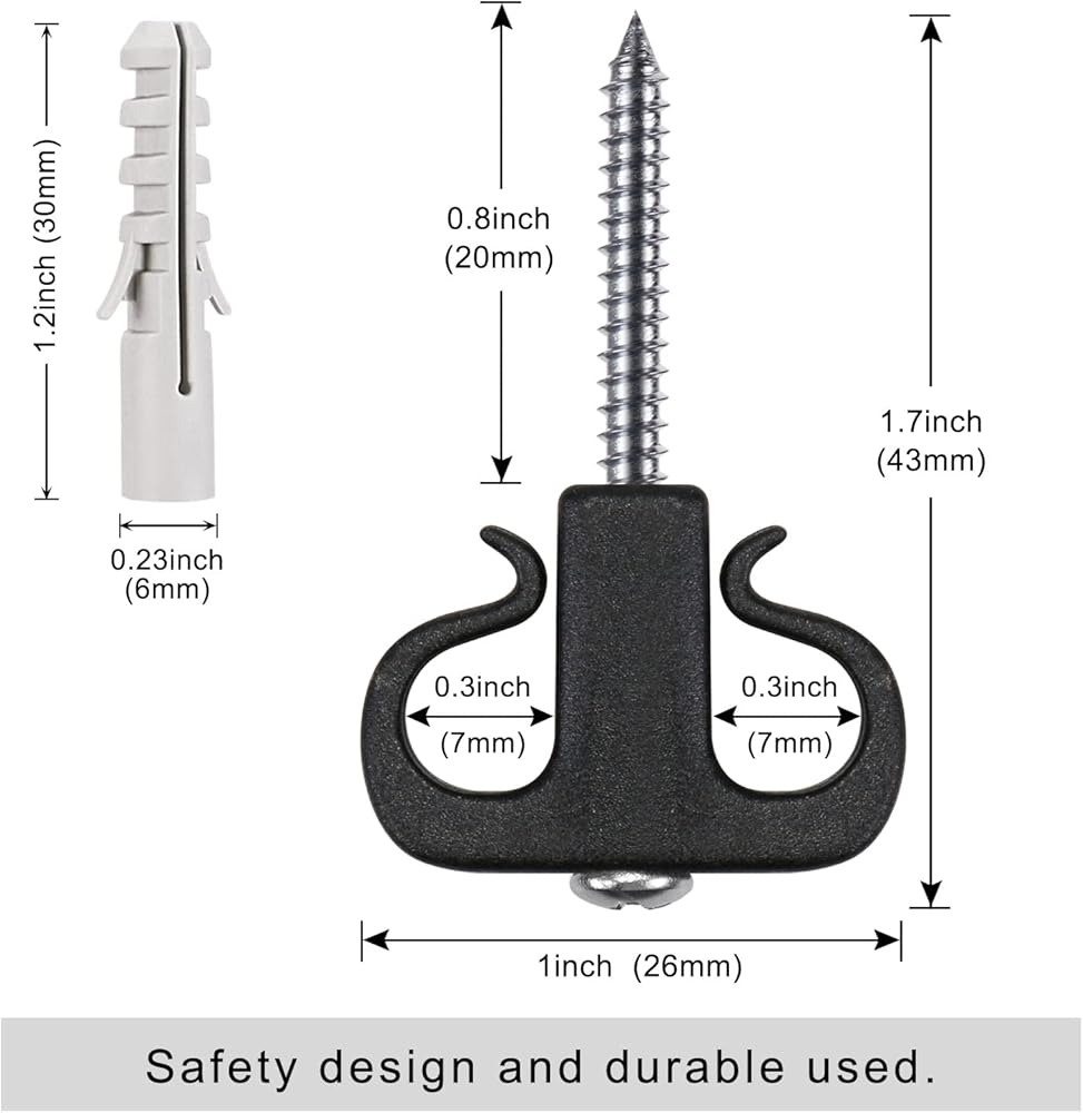 【PERFECT SIZE】These hooks have a hook length of 4.8cm/1.89inches that can fit for many goods and a screw length of 2.6cm/ 1.06inches that is firm and stable. The opening is (3/32 inch) wide enough to accommodate most wires or strings.