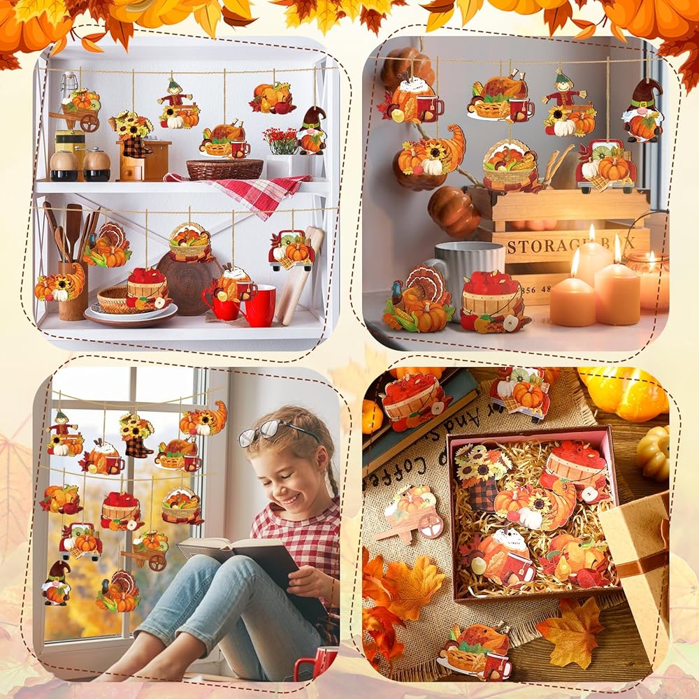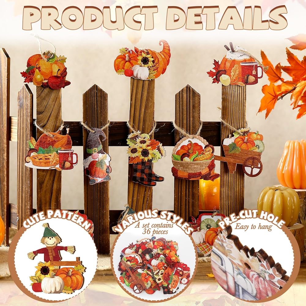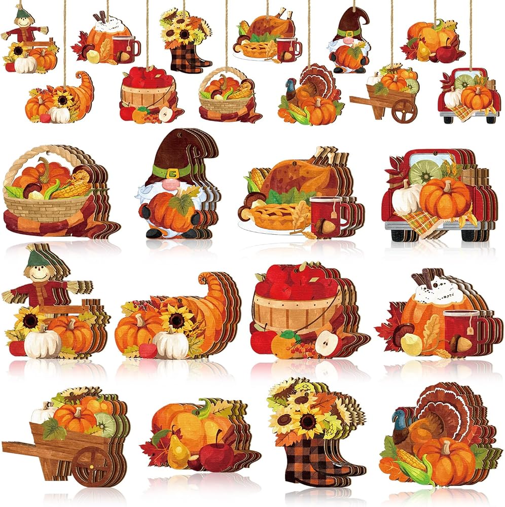 Huwena 36 Pcs Thanksgiving Tree Ornaments Fall Tree Decorations Pumpkin Scarecrow Turkey Gnome Wood Cutouts with Ropes Fall Wooden Ornaments for Autumn Harvest Party Decor