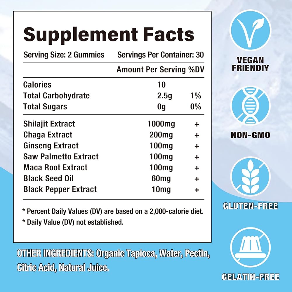 7-In-One Advanced Formula: Our shilajit supplement gummies provide a rich source of nutrients, including 1000 mg shilajit extract, 200 mg Chaga extract, 100 mg ginseng extract, 100 mg maca root extract, 60 mg black seed oil, and 10 mg black pepper extract in each serving of 2 gummies. These shilajit gummies offer comprehensive support and nourishment for your body, promoting a healthy and vibrant lifestyle