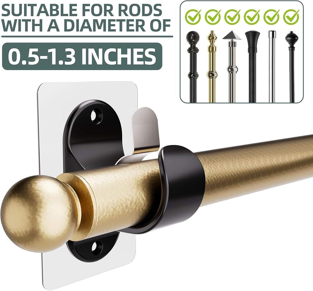 8 PCS Curtain Rod Hangers for Max 1.3in Rods: No Drilling, no damage to the wall. These curtain rod hangers suit rods from 0.5-1.3 inches in diameter. You will get 8 brackets, each measuring about 3.54 x 2.36 x 2.13 inches
