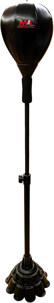 The freestanding punching bag is a great training equipment to improve your boxing and striking skills because the plastic rod has been specially designed to give a spring effect that allows the speed ball to swing and sway when punched. This will enable you to improve your timing, to increase your hand to eye coordination, your striking accuracy and develop your striking speed and reflexes. The standing speed bag consists of a plastic base with a lower high-strength PVC spring-like rod, of a robust black powder coated steel upper rod and of an inflatable speed bag. Assembled together, the base and the rods act like a spring that has whip effects when punched which is ideal for training. The base is fixed to the ground with a total of 10 powerful suction cups for maximum stability. A pump to inflate the reflex bag is also included in the package. Take your striking skills, your speed and your reflexes to the next level with this standing reflex boxing bag. Because the rods are made from specifically designed high-strength PVC plastic, the speed punching bag bounces back and forth quickly after each hit putting your hand-to-eye coordination to the test. Also, because of the 10 suction cups, the base is very stable and firmly anchored to the ground. The reduced base diameter doesn't require being filled with water or sand and enables you to step in as you punch! The standing reflex speed bag is robust & built to last because the base is made of high-quality plastic and because the lower rod is made of high-strength PVC material that has been designed to withstand multiple & intense training sessions. The reflex ball made of superior composite material with reinforced stitching is also built to last and comfortable to train with. The speed bag is fit for most as the height can be adjusted up to 60 inches. You do not need to be a professional boxer to train with the standing punching bag. Training with the standing boxing bag will increase your cardio and your overall fitness level because it will require your whole body to move while drilling your strikes. As the intensity of the workout depends solely on you, you will be able to adapt this intensity to your fitness level in order to ensure a steady and safe progression. IMPORTANT RECOMMENDATIONS – The 10 suction cups work most efficiently on smooth floor surfaces such as wood, tiles & marble floors. They will not work when used on rough floors and carpets. Make sure the suction cups are kept clean as dust on them will affect their suction capacity. For better feel when striking and prolonged life, we recommend to only inflate the reflex ball to the point where it makes a slight depression when pressed.