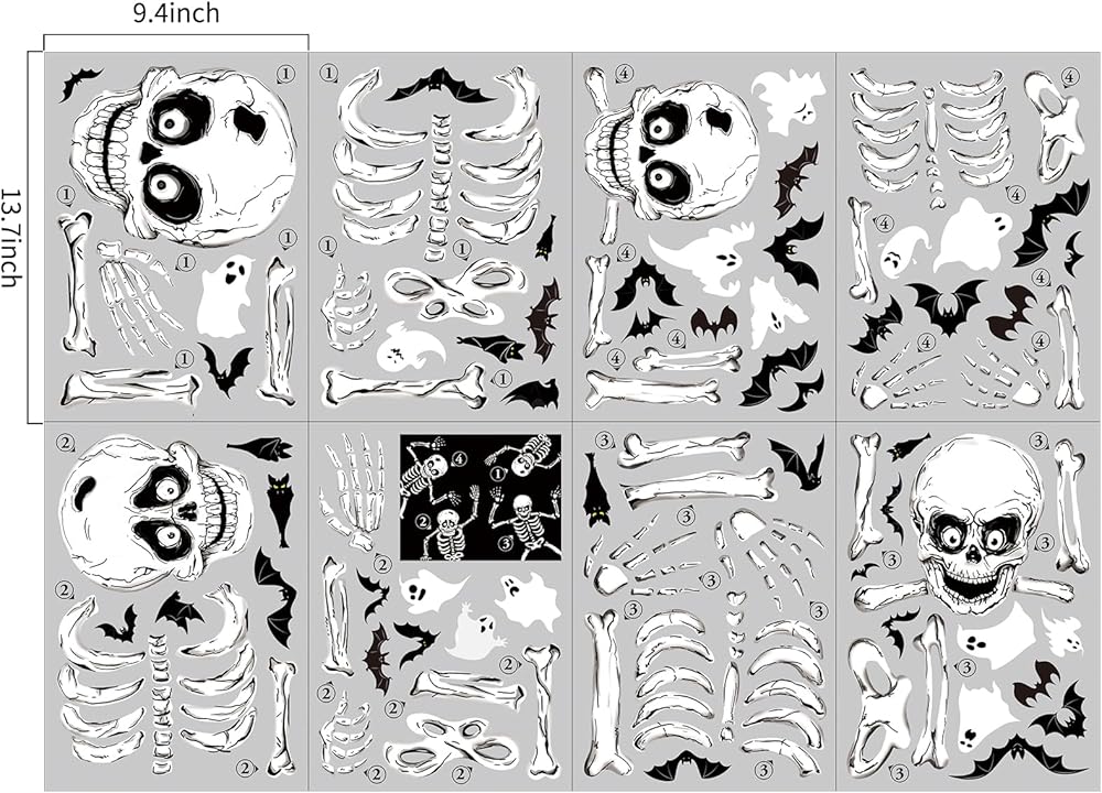 HALLOWEEN WINDOW STICKERS: Set includes 8 sheets of creative Halloween window stickers featuring adorable bats, ghosts and skeletons. Decorate your windows and mirrors with these charming stickers to instantly bring a festive and joyful atmosphere to your home and add Halloween fun.