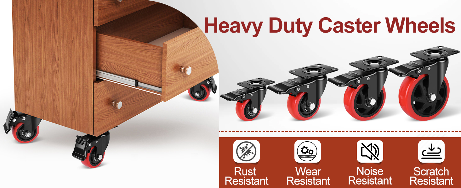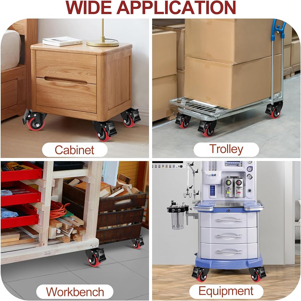 【Smooth and Silent】Heavy duty caster wheels are easy to move, shock absorbing and noise reducing, can glide smoothly and quietly on most surfaces. Wear resistant and fade resistant, locking caster wheels will not cause scratches, scuffs or other damage to floor. Castor wheels sets 4 also save your effort and allow you to move heavy objects with ease.