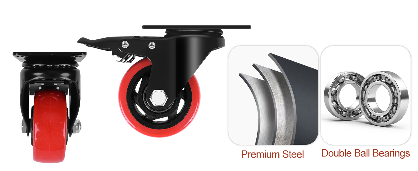 【360° Rotation】Plate casters can rotate 360 degrees. Each swivel caster has a separate brake, it can lock both wheel and swivel at the same time. With double ball bearings and dust ring, internal friction and dust ingress will be reduced. Make wheels for carts heavy duty rotate more smoothly and easily move in any direction with little effort.
