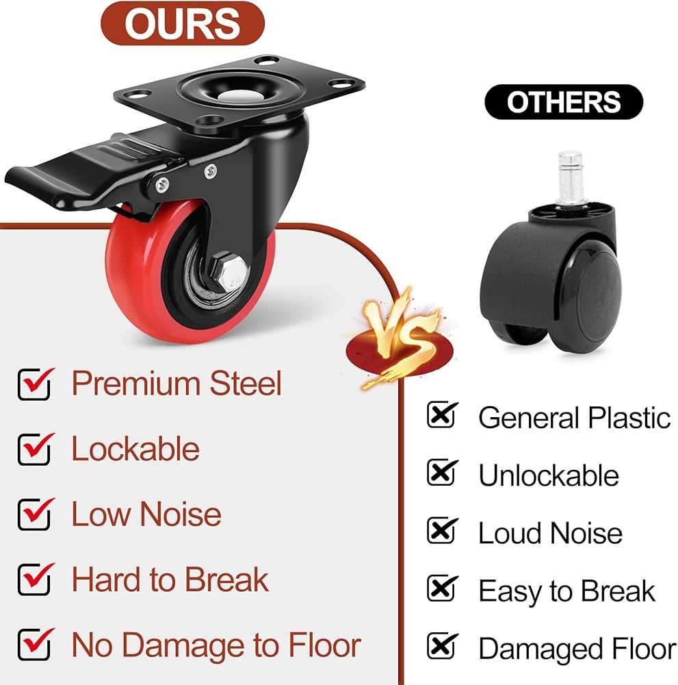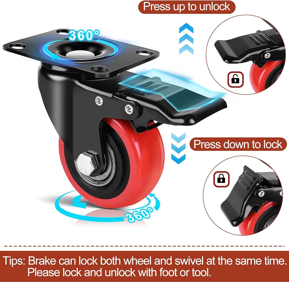 2 Inch Heavy Duty Caster Wheels Set of 4 With Brake 360 Degree Swivel Top Plate Casters Cart Wheels Silent Locking Industrial Casters Polyurethane 600 Lbs Castor Wheels for Cart, Furniture, Workbench