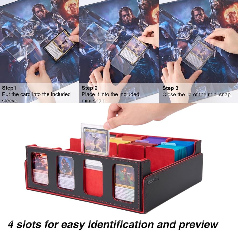 【4 Display Slots for Easy Card Preview】This storage box features slots on one side to showcase 4 cards, allowing you to easily differentiate between boxes and preview their contents. It comes with mini snaps and sleeves for each card.