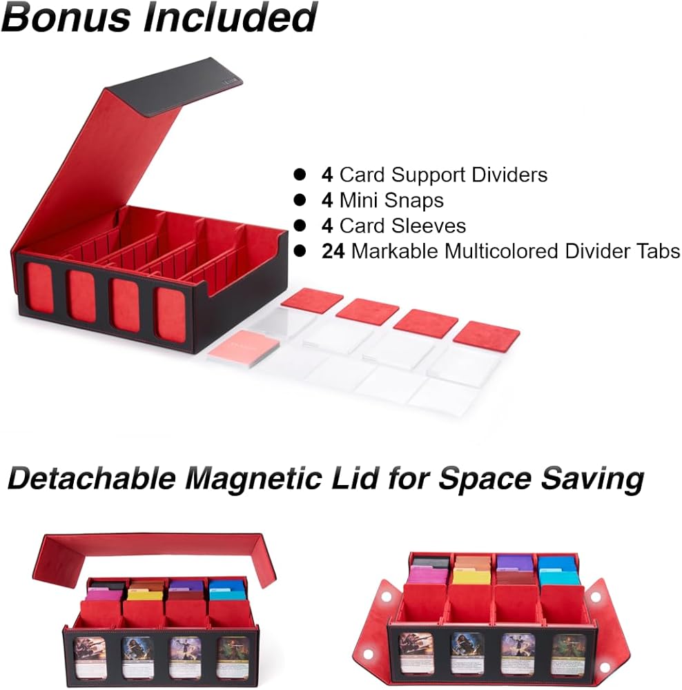 Venssu Card Storage Box for Trading Cards with Card Supporters, 3000+ MTG Deck Box with 24 Colorful Divider Tabs, Trading Card Storage with Viewing Windows Fits for Magic Game(Black and Red)