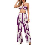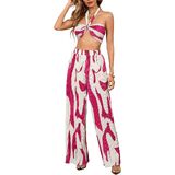 - Design: Two piece outfit, graphic print, sleeveless, tie backless, crop, ruched, wide leg, high elastic waist, lettuce trim, flared, knitted, pleated