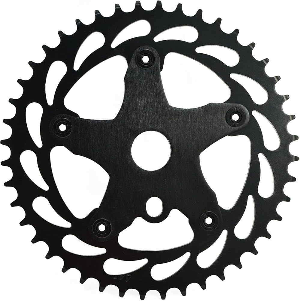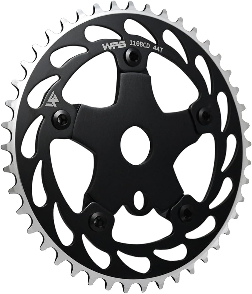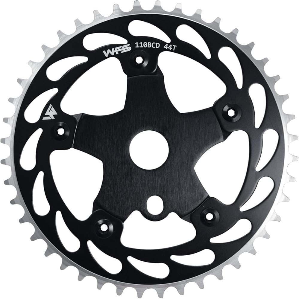 Enhance your cycling performance with the WFS Helix Chainring w/ Spider Sprocket. Constructed from top-grade anodized aluminum alloy, this chainring delivers outstanding durability and resistance to corrosion. The 44T configuration is designed to work seamlessly with 1/2" x 1/8" chains, ensuring smooth and accurate gear changes. Featuring a 5-bolt 110mm BCD pattern, installation is quick and straightforward. Weighing in at just 153g, it improves performance without adding significant weight. Manufactured in Taiwan, known for its high manufacturing standards. Ideal for Old School BMX and single-speed fixie bikes. Enjoy a more efficient, faster ride with the WFS Helix Chainring w/ Spider Sprocket!