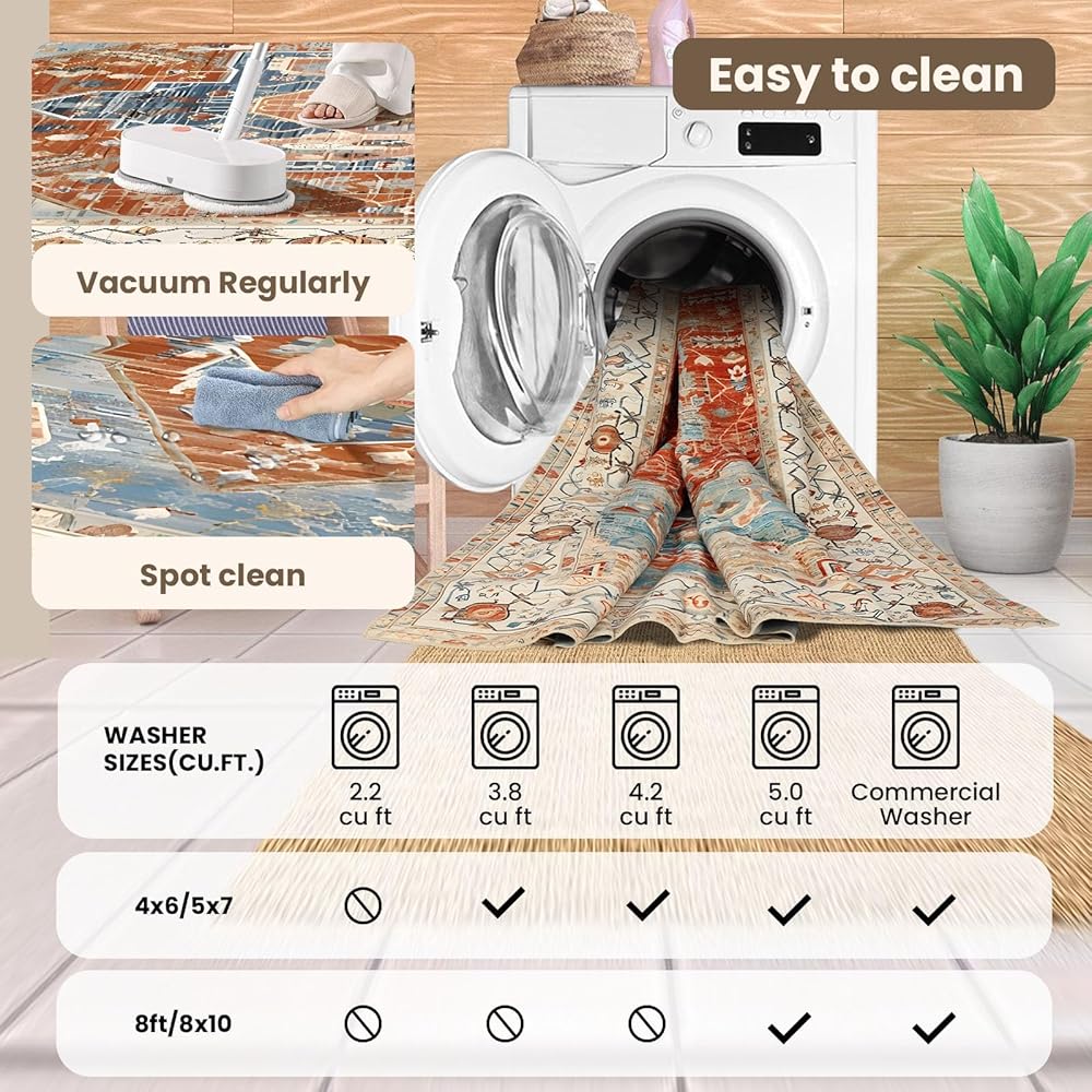 Machine Washable : This machine washable rug is the best choice for high traffic areas with children and pets at home. This rug is machine washable and very easy to care. Use a broom or vacuum cleaner to Clean up or hair for daily care, if excess liquid remains or dirt on the surface of the rug and you want your rug to to be thoroughly clean, Machine wash with cold water on gentle cycle(not to add bleach),air dry or dry on air-only cycle with out heat.