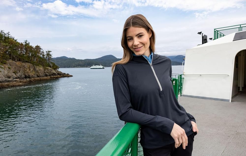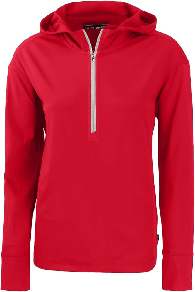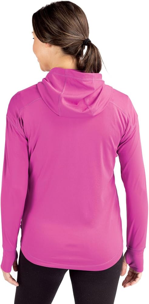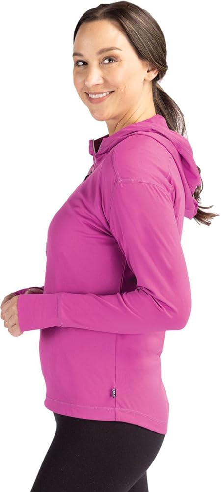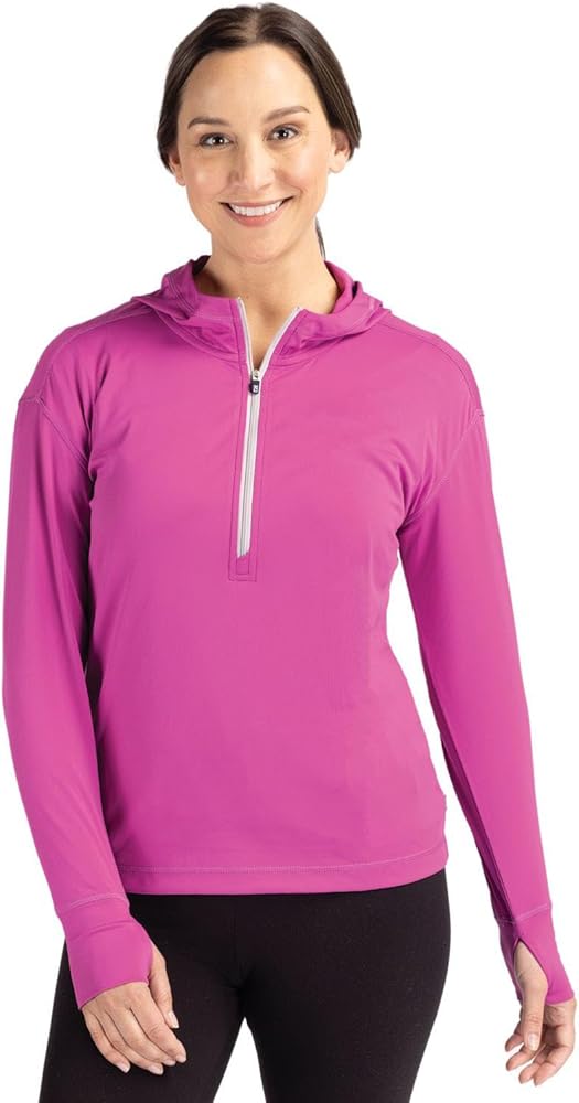 The iconic Daybreak Eco Recycled Half Zip Hoodie is engineered for exceptional versatility, designed as your favorite sustainable womens half-zip lightweight layer for your active life: work, golf, tennis, travel, or any everyday adventure. Our ultra-lightweight, high quality, moisture wicking, certified eco-friendly recycled polyester is blended with spandex to provide four-way stretch, a cooling effect, and UPF sun protection, resulting in the most versatile, sustainable, and comfortable top for you and the planet. 88% Recycled Polyester, 12% Spandex Fine Gauge Interlock with matte appearance Material made from 14 recycled plastic bottles UPF 50+ UV Sun Protection Moisture Wicking Zip placket with hood Thumbholes Shaped hem Coverstitch at seams Global Recycled Standard Machine Wash Imported