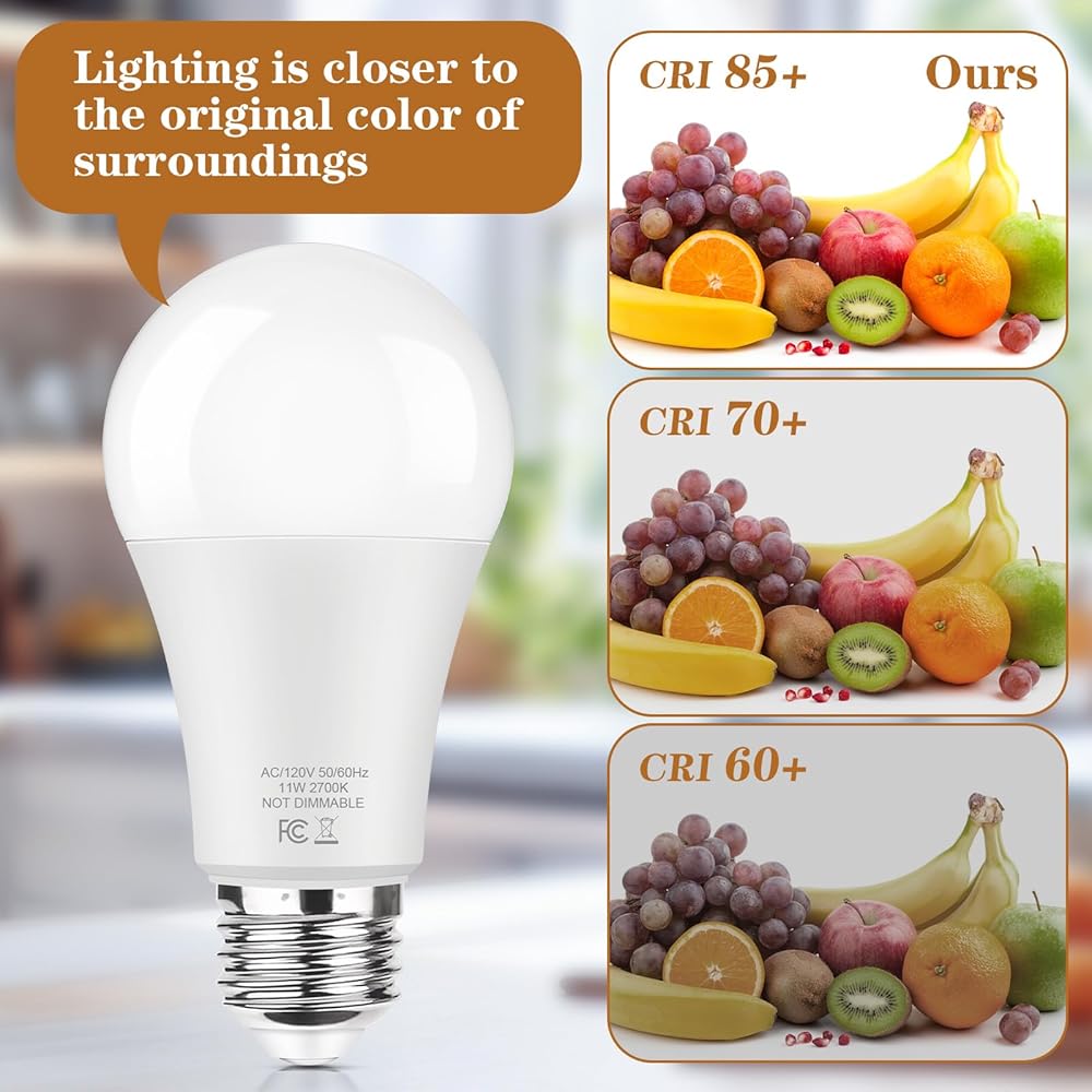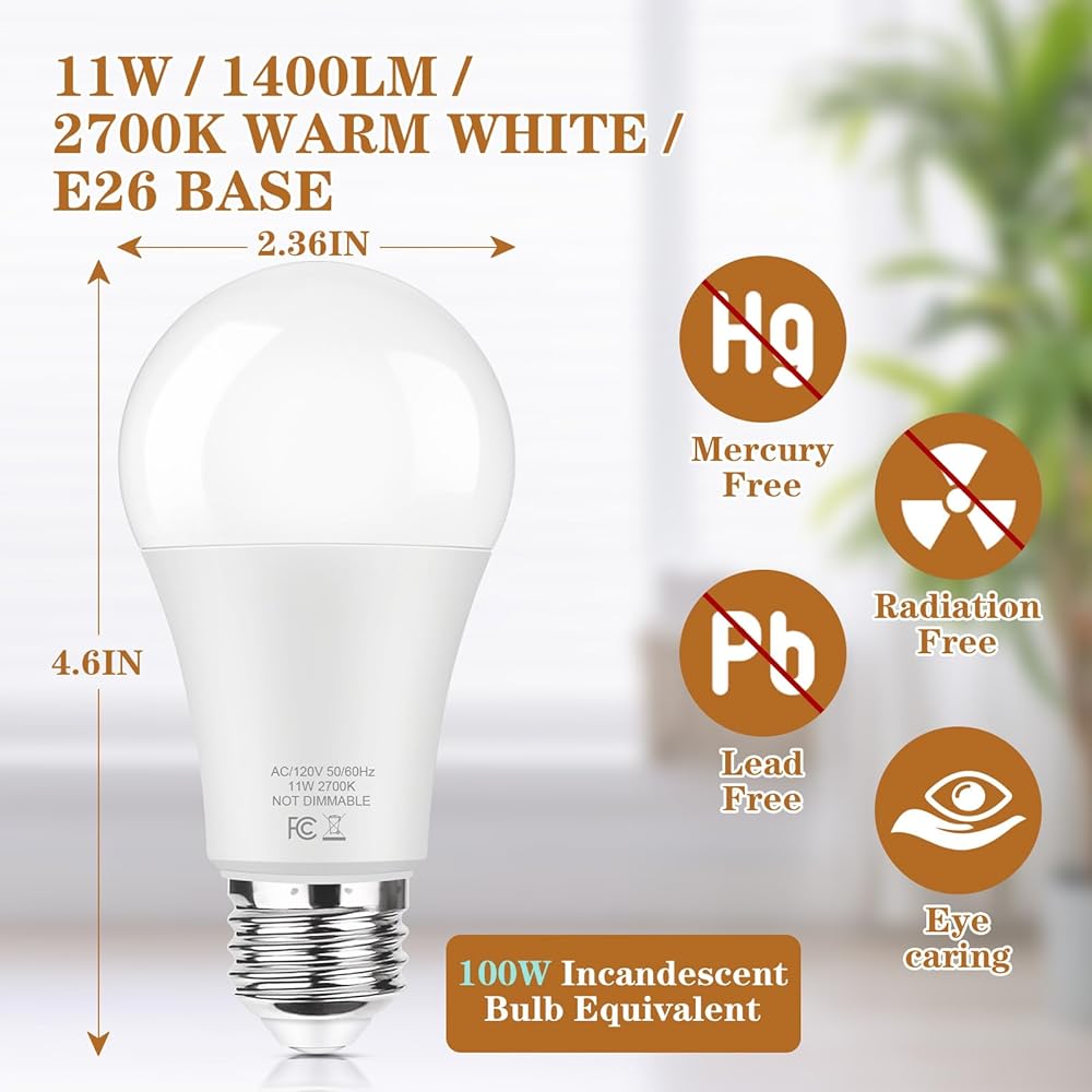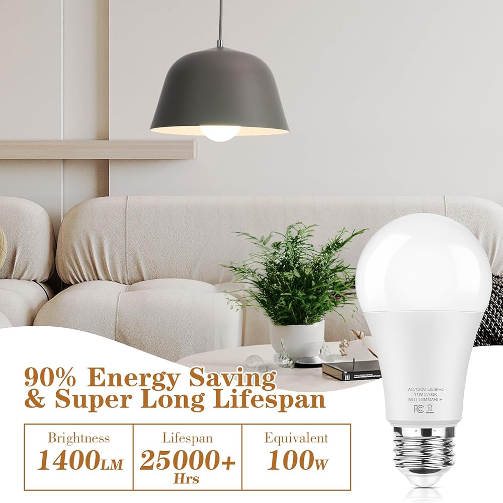 6 Packs A19 LED Light Bulbs 11W, 100W Equivalent, High Brightness 1400 LM Led Bulb, Warm White 2700K, CRI85+, Long Lifespan, Non-Dimmable Bulb with E26 Standard Medium Base for Lamps and Home Lighting